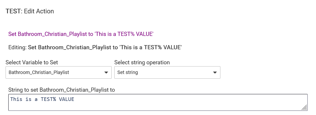 In this one, you're setting a string variable to a value that interpolates the value of a variable named " of the class passed with greater than 85", which presumably does not exist (is null) on your hub, so this result would be expected. Percent signs are used to enclose hub variable names in many places of the RM UI that allow for arbitrary string input, this included.