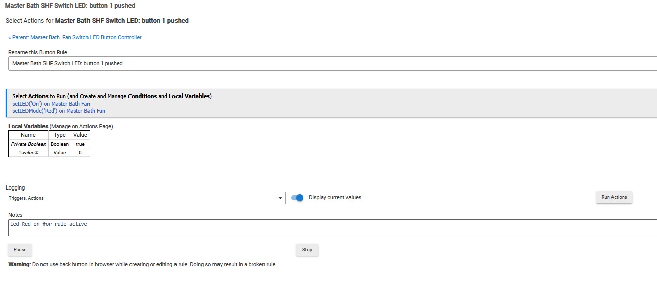 I have a Button Controller 5.1 for that virtual button, with custom actions to drive the LED of the Zooz Switch (Fan).