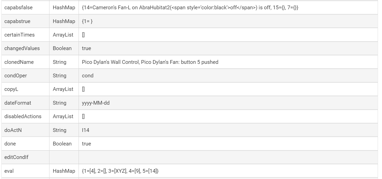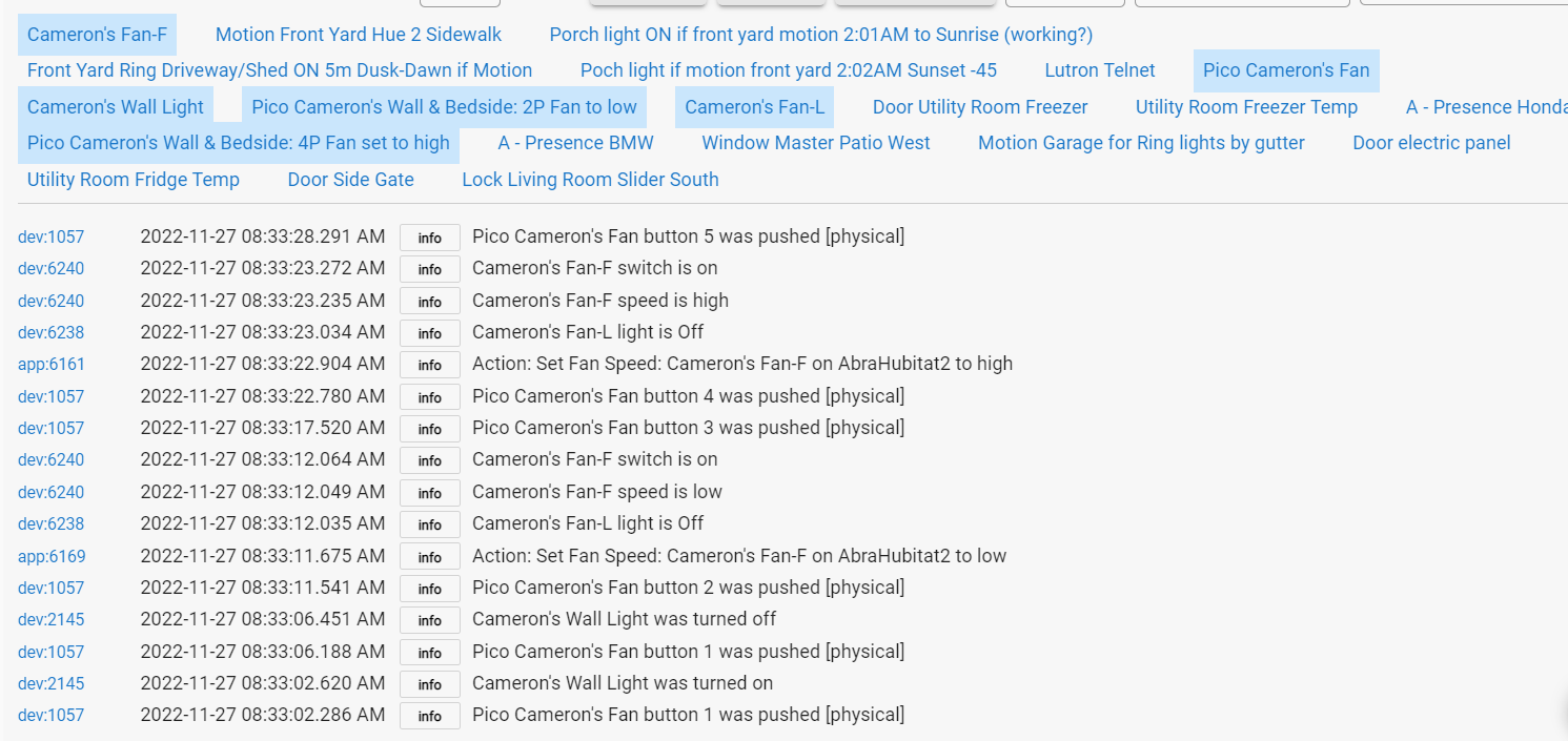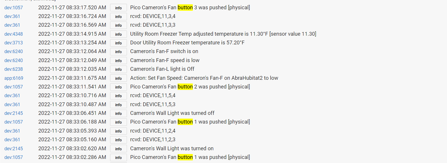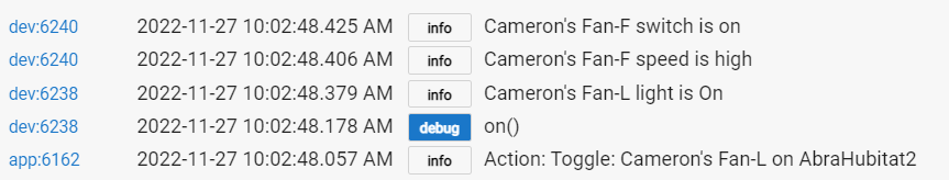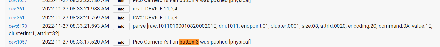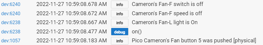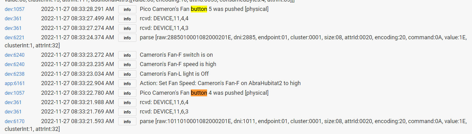 One example: Logs below for a Pico that I have had set up to control a fan in my son's room, set up about a year ago. Nothing changed on the Button Controller settings in at least a year, worked w/out issue. Then I replaced the fan device in Button Controller to the device from the new version of the HE Bond integration.