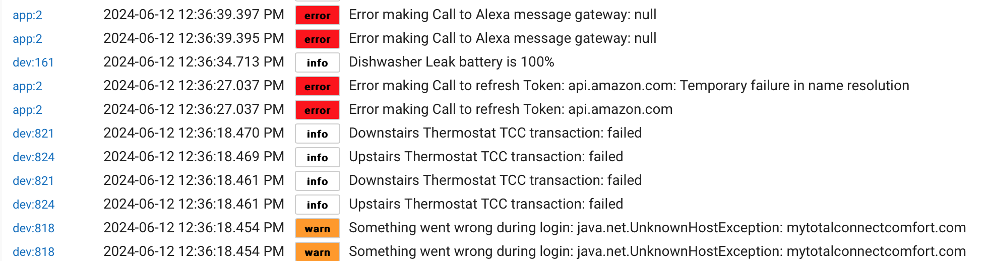 Once the hub came back up I looked in the logs and I noticed the following. DNS entries appear to have started failing earlier this morning. I wonder if those errors piled up in some way and caused the unresponsiveness. I have attached a screen shot of those errors. I'm not sure why this is happening but wanted to make someone aware of it. I'm happy to help in whatever way I can.