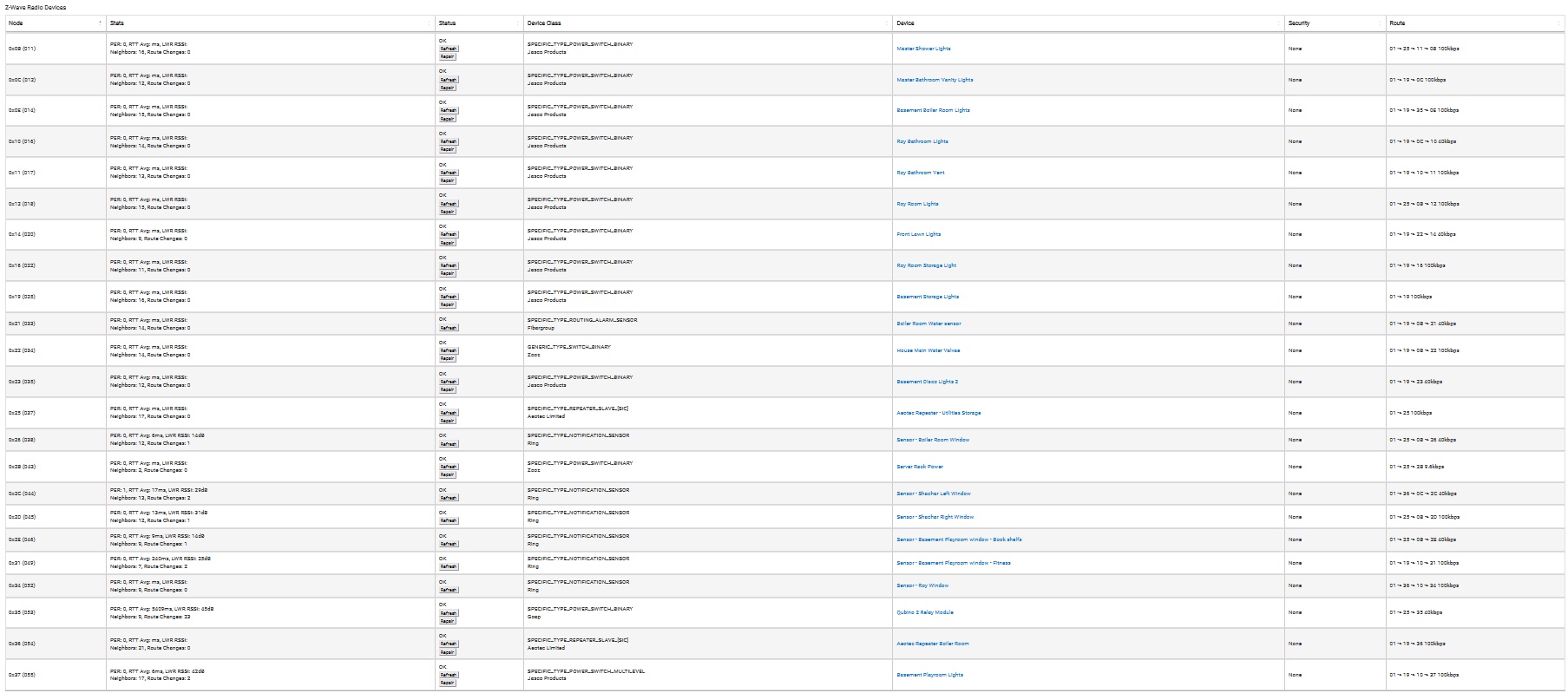 Interesting that the vast majority of your devices are repeating through just two repeaters... that jabsco switch and an aeotec repeater. Usually I'd expect not to see so much reliance on repeaters.