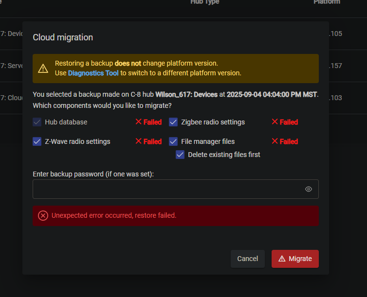 The current C8 Pro arrived about 3 weeks ago (this is actually the replacement unit). When I first attempted the migration to this unit, I was initially optimistic - both the devices page and Z-Wave tables populated properly, which was an improvement over previous attempts.