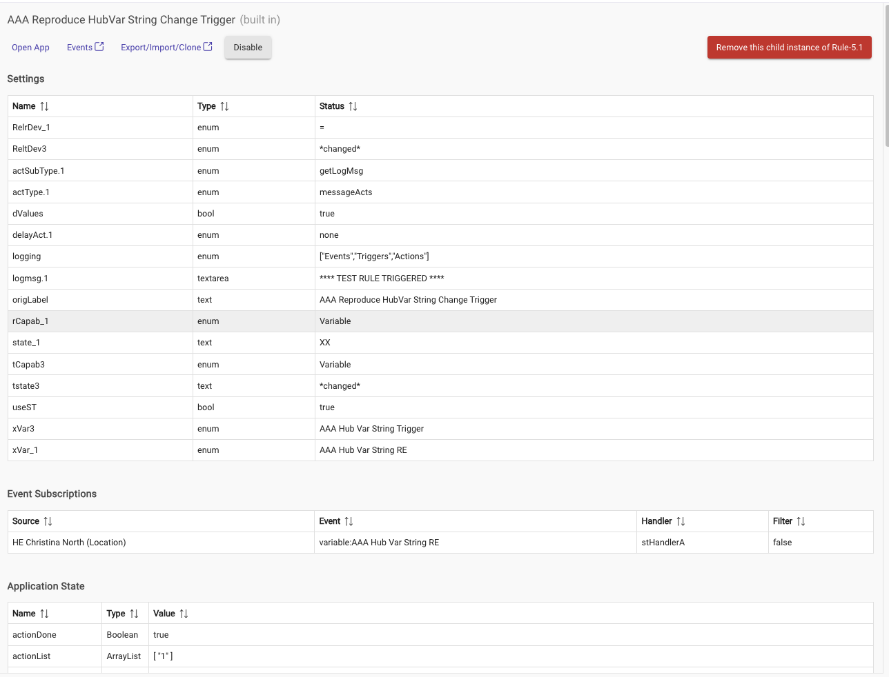 Hmm you have me doubting myself, so I rebuilt the same rule from scratch for a third time with new hubvars and it still doesn't trigger. Below is my most recent attempt on a C7 along with the Event Subscriptions. FWIW if I do this same thing on my Dev hub (C8), it works as expected.