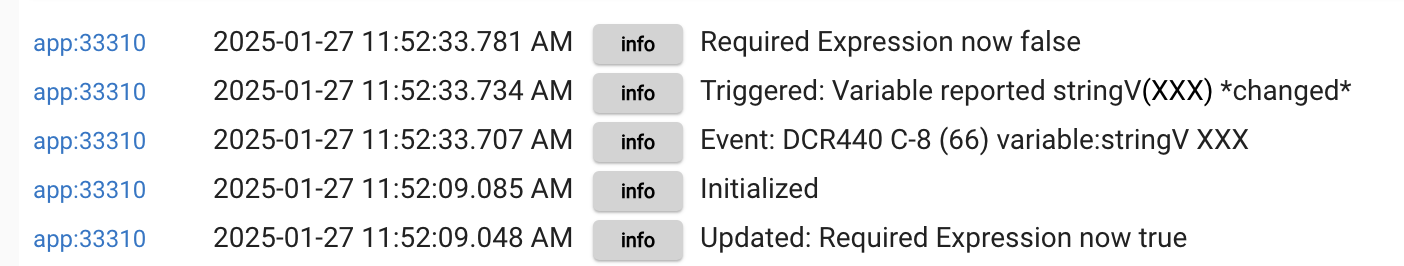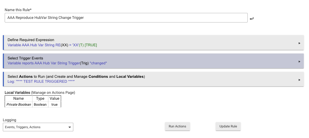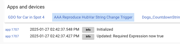 @bravenel, I'm inferring this bug squash hasn't been released yet since I haven't seen it in the release notes. Assuming this is true, wanted to let you know that I'm seeing a variant of the bug on C7 2.4.0.151 even when two different variables are used across RE and Trigger. See the below example--it doesn't trigger as expected. I've been able to reproduce, but oddly not on my C8. Hope this helps tracking it down.