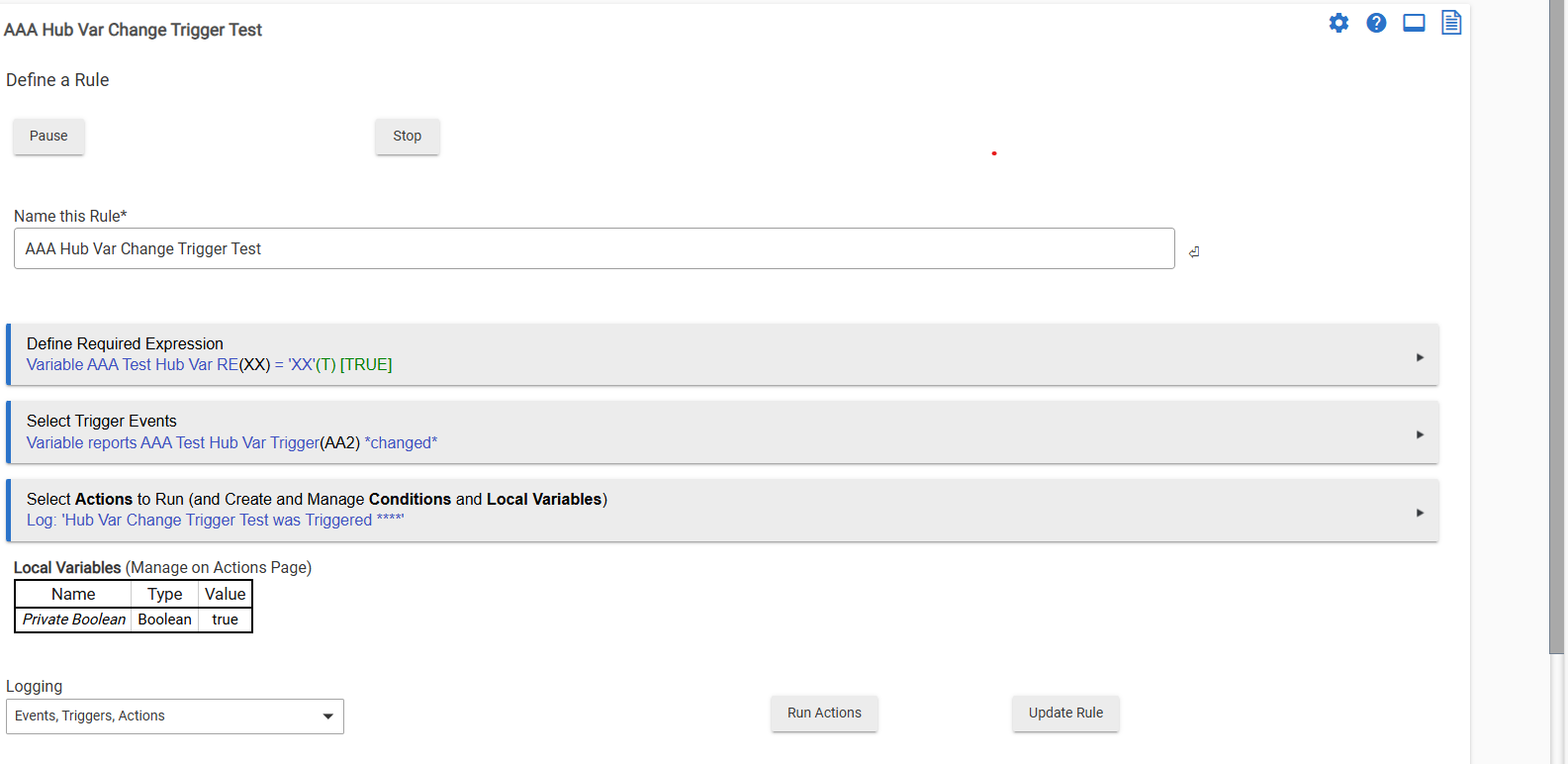 Correct. After updating rule, I went to Settings/Hub Variables, clicked on current value of variable, and changed it to another value. Rule not triggered.