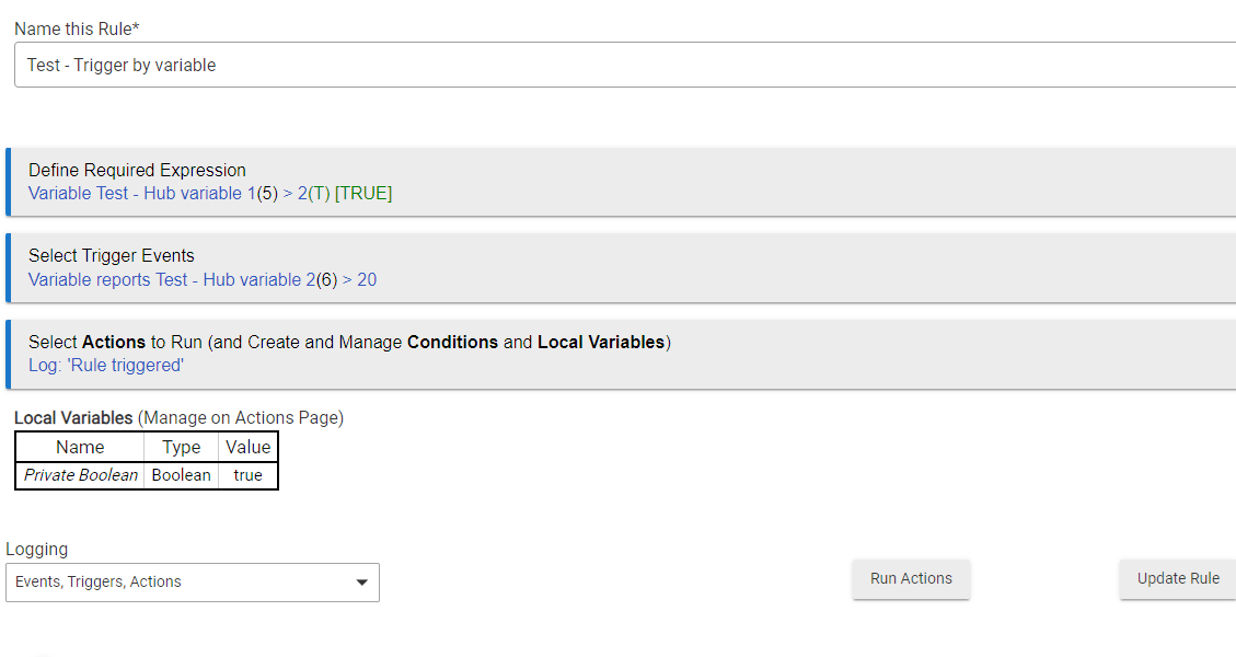 I've tried setting the two variables to different values both under and over the conditions in the trigger and the Required Expression and hit "Update rule" and "Done" on the rule several times during this testing, but nothing has managed to get the second variable into the event subscriptions (which I assume is a requirement for the rule to trigger) or get the rule to run the actions.