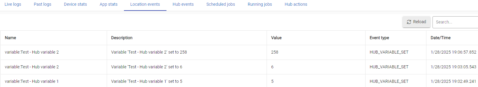 - Change the variable "Test - Hub variable 2" to a value larger than the trigger value (which is >20). In this case I set it to 258, which should trigger then rule since the required expression is already True. The Location Events log confirms that the variable was changed: