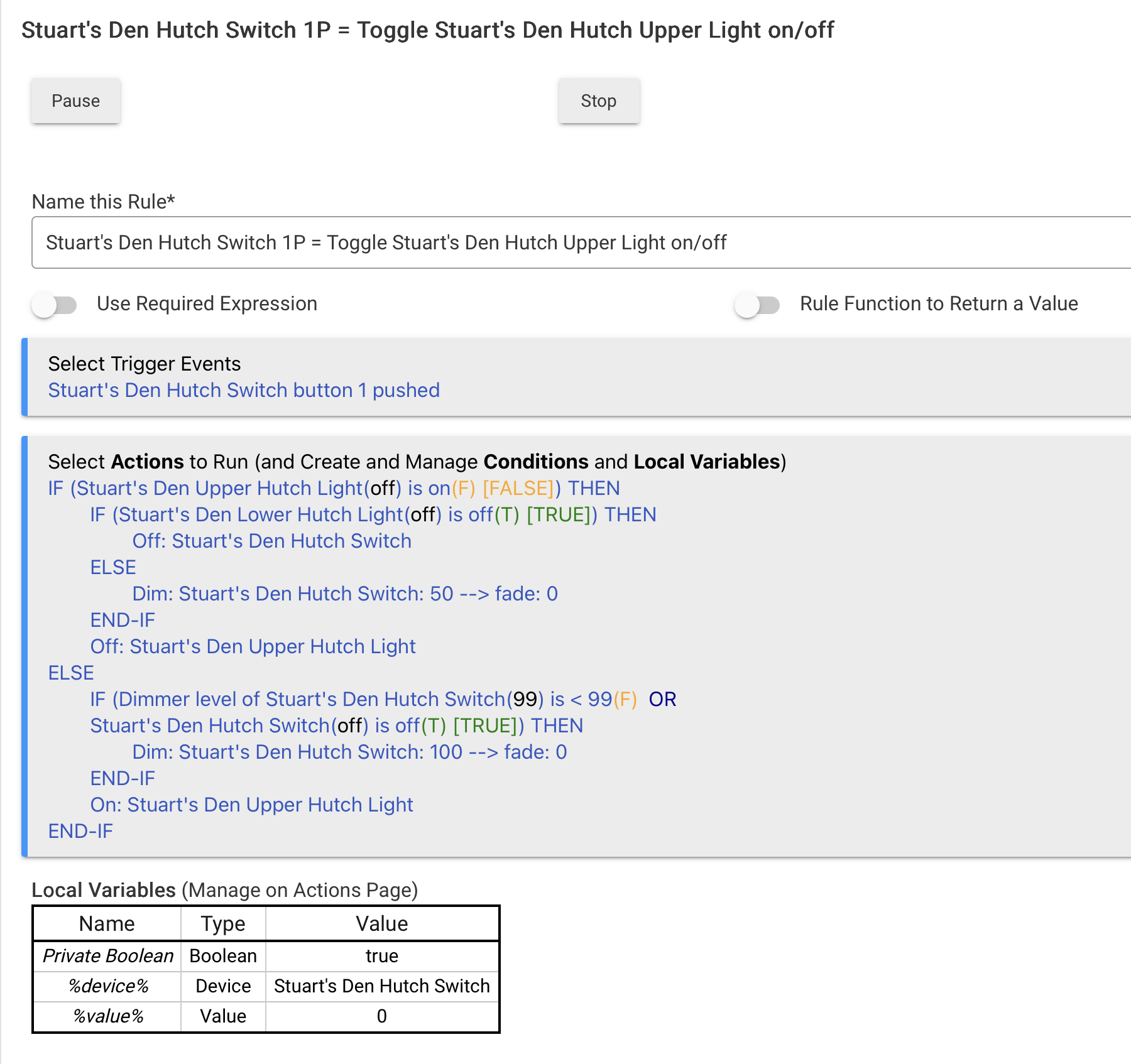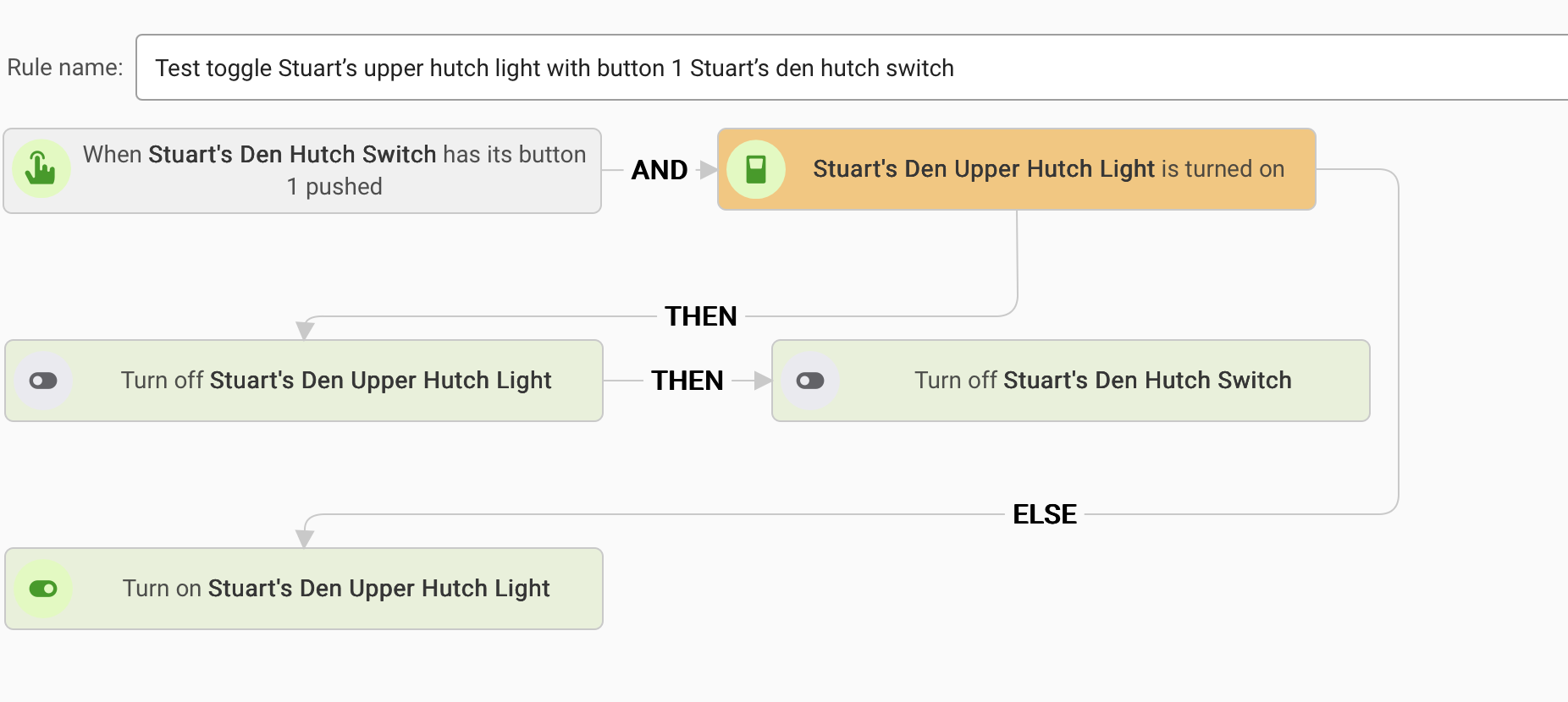 I also find the VRB labeling misleading in that it appears that the rule should only run if the hutch switch is turned on AND the upper hutch light is on. That's not the case. It would be much clearer if that AND was an IF, i.e. When the hutch switch is pushed IF the upper hutch light is on THEN ... ELSE.