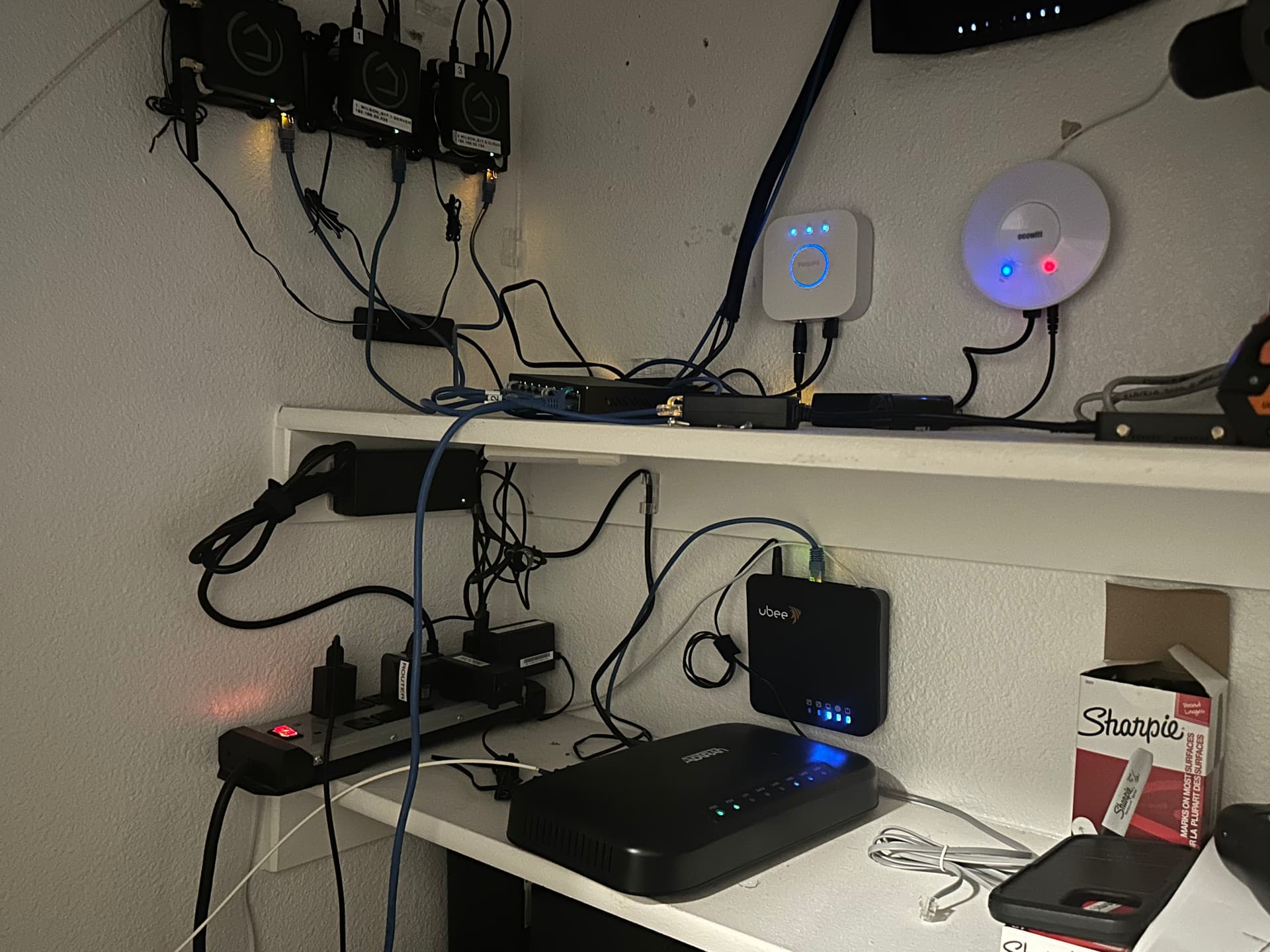 Itâs a bit messy at the moment. But the modem is sitting on the second shelf and the fiber cable is just sorta loosely hanging in there. They were lazy when they installed it.