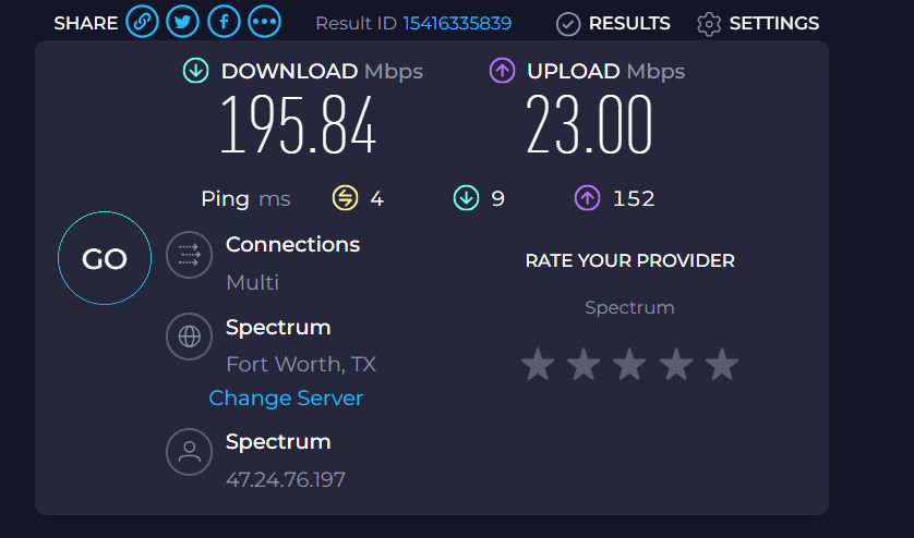 I used that yesterday morning. The tests I did last night were on the regular Speedtest.net. That spectrum site says the test is provided by Ookla, I have no qualms with setting it back up directly and using there âownâ site just to document it. Funny thing is when I connected directly to the modem it took it a few minutes to recognize there was a connection. Iâm debating if I need them to come out again, I might just have them move the modem to a bette spot or just mount it. Right now itâs just sitting on a shelf. Iâm always afraid of braking the fiber cable.