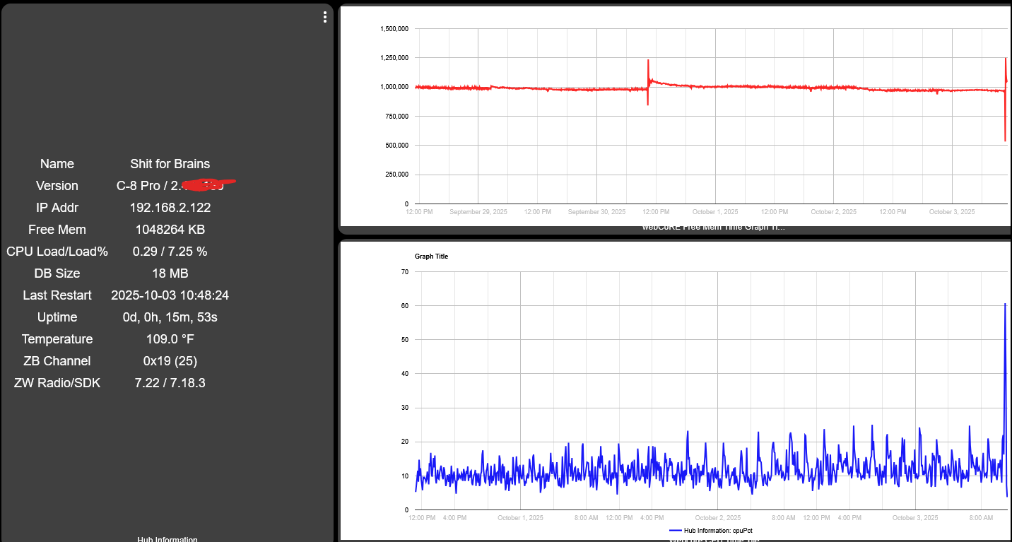 Thanks, I will look into setting up a memory graph. Update: I got direction to do a soft reset and backup the database. Did so, but after booting the hub was not able to control z-wave devices. I watched the app stats and devices stats drop to normal levels. However, after a time the settings page would no longer respond. Shortly after that, the hub returned to being unresponsive, no diagnostics page, but responding to pings. Was asked for MAC address and provided it yesterday, waiting on next steps. Hopefully will get some good direction soon. I am guessing this is a weird one. Thanks all.