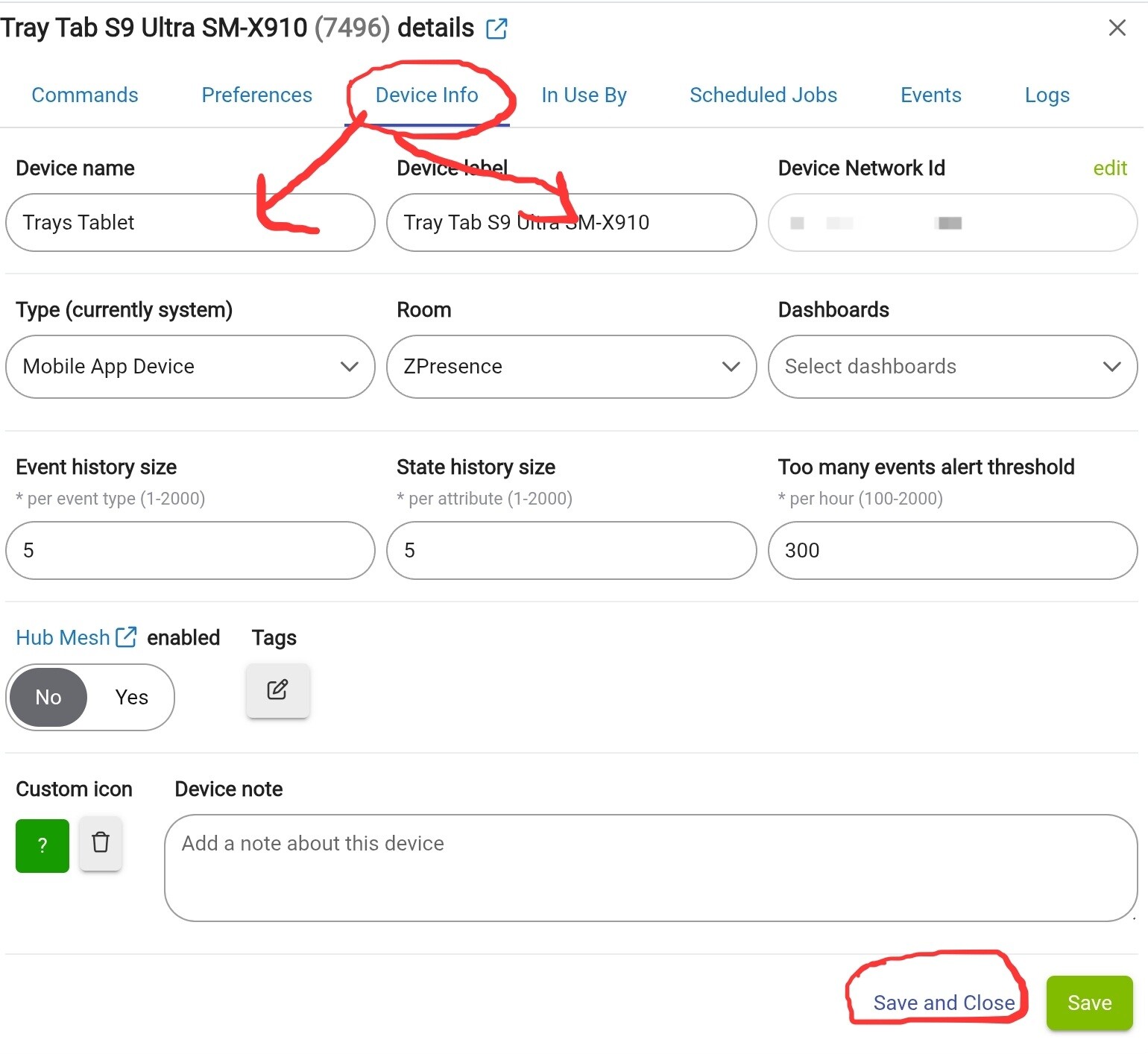Click on the device, and then click on the "Device Info Tab", you should be able to change both the Device name and Label for any existing device, and then click Save and Close