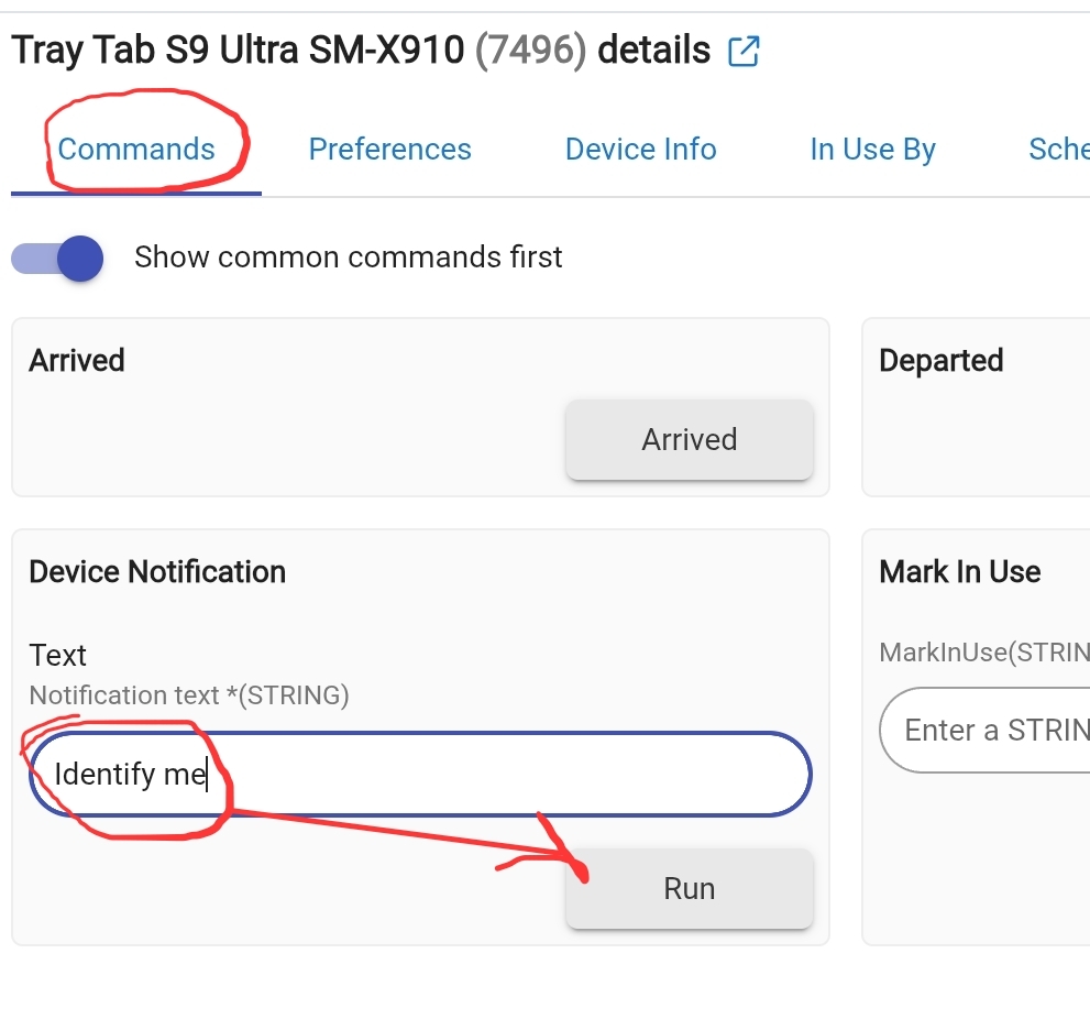 Also note that if you are not sure which device you are looking at and they have the same name, you can send a test message to the device by going to the "command" tab, typing text into the "device notification" box (I typed "identify me"), and clicking run. The phone that is that device should get a message if it is logged into the app.