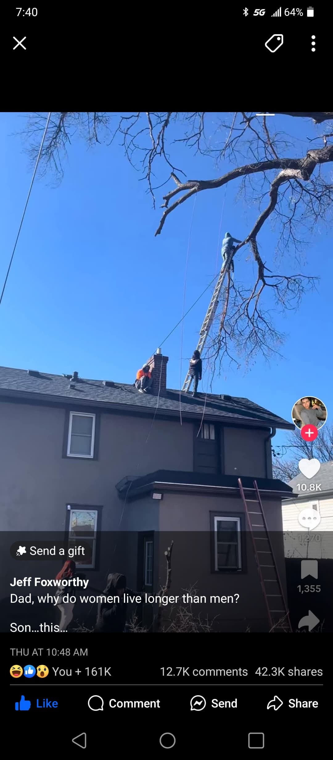 I love all the ropes hanging from the upper branch. And he is about to saw off the branch the ladder is leaning against?