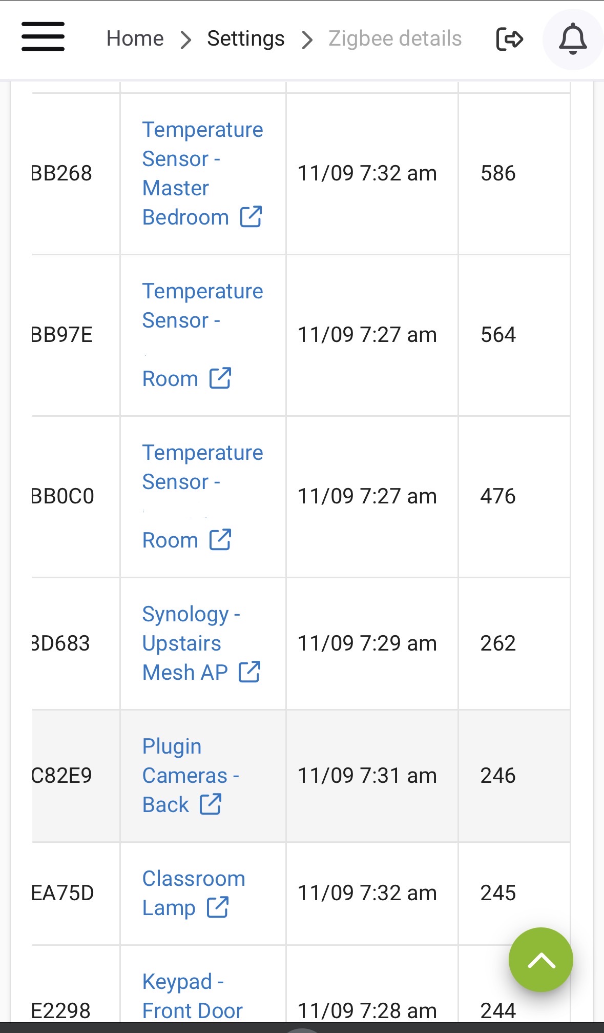 Below that start the Centralite plugs. Theyâre grouped pretty well together (182-262). Below those are my other battery powered Zigbee sensors (door sensors mostly).
