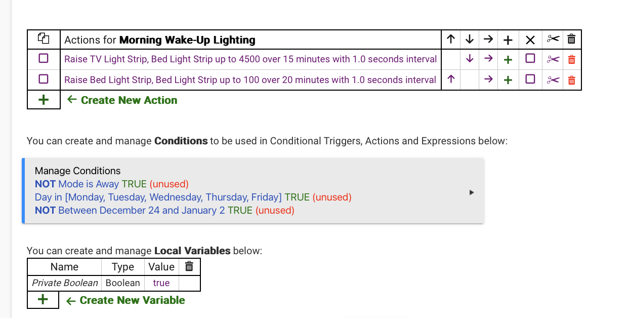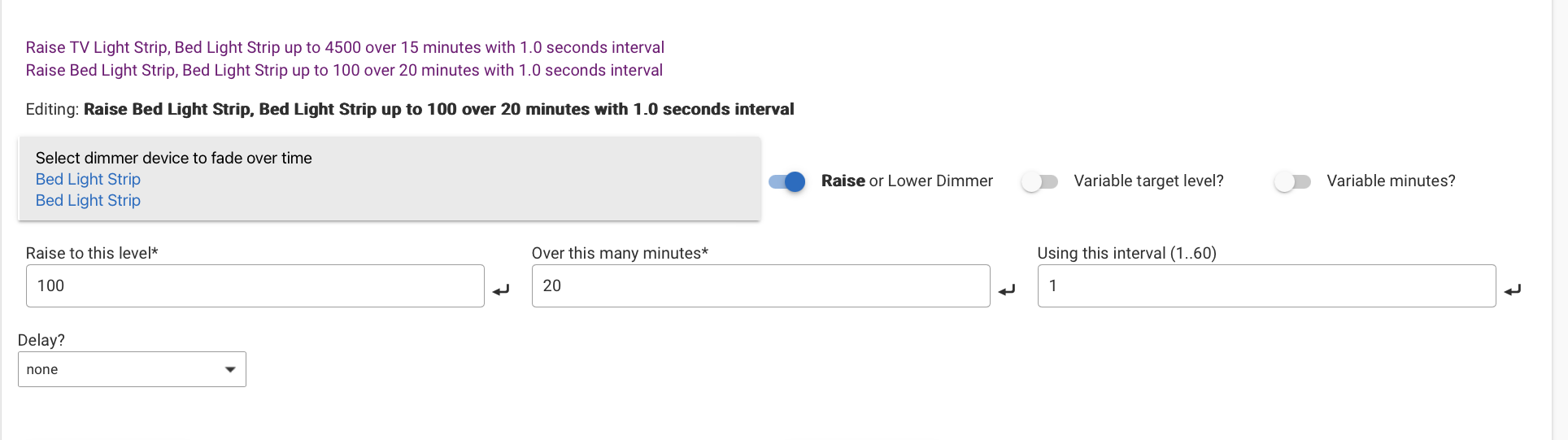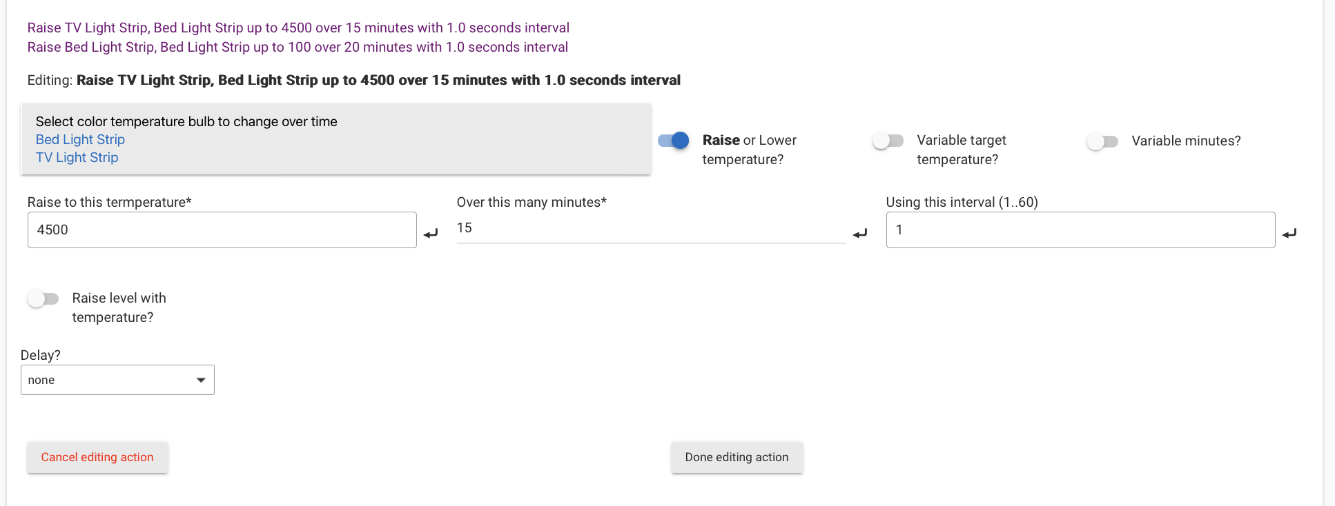 I'm trying to get a rule working so that gradually (1) raises the temperature of two LIFX LED strips (using the built-in LIFX app) from a red/warm glow to a cool daylight temperature and (2) raise the brightness level from 1 to 100. Interval is set to 1 second.