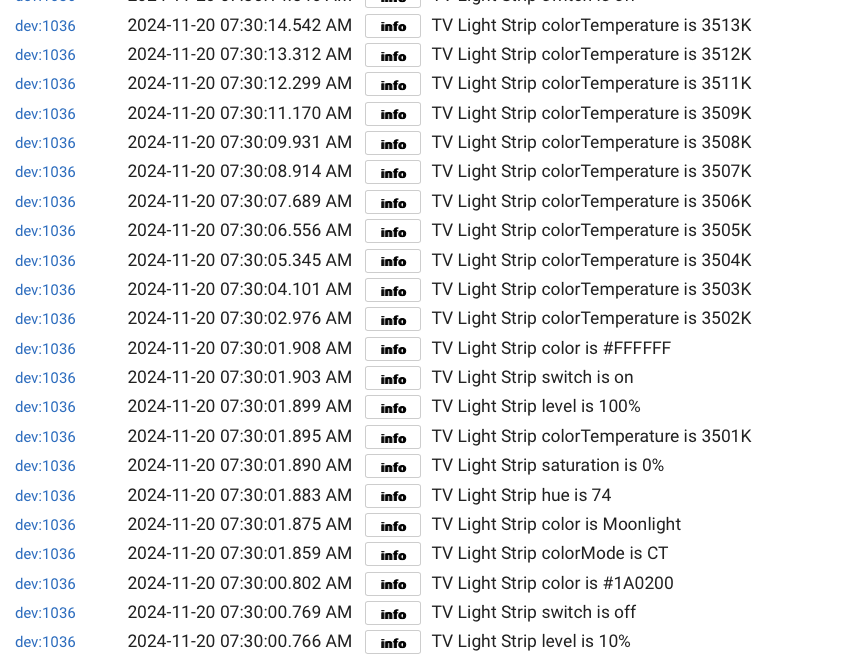 Additionally, the brightness level on one of the lights (TV Light Strip) starts at 10 (instead of 1) and quickly jumps to 100% one second later. On this light, the temperature starts at 3501k, which is too cool and seems to be a broken action.