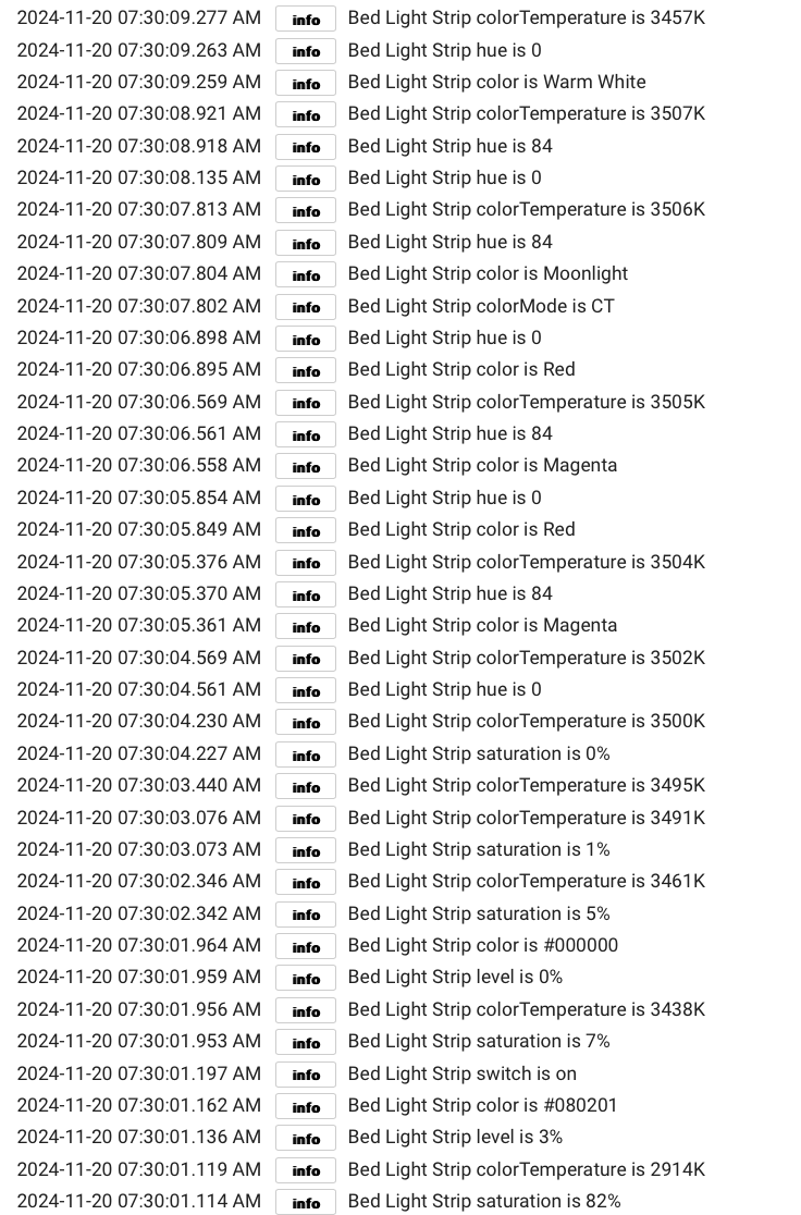 Upon looking at the log, the temperature (for Bed Light Strip) starts at 2914k, then less than one second later jumps to 3438k. Then, it seems to begin to more gradually increase the temperature as expected, but the initial jump from warm to cool at the start of the transition is unexpected and seems broken to me.