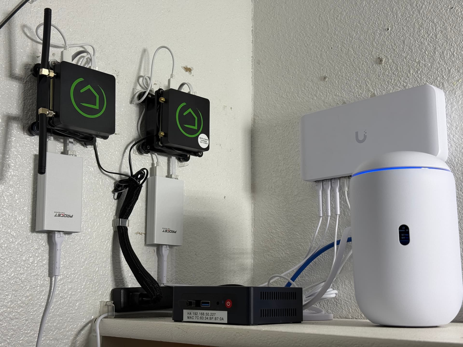 Looks like Ike we run a lot of the same stuff. I also have a mini PC running HA (bought it off Amazon with HA pre-installed), a UDR7 as my in house router, if that is the POE 8 port switch I have one of those. I bought it to be my switch off my UDR7, but I later switched all my cameras over to Unifi so I then put in a 24 port switch in the mini wrack and repurposed that switch to my out building where it serves several items including an access point.