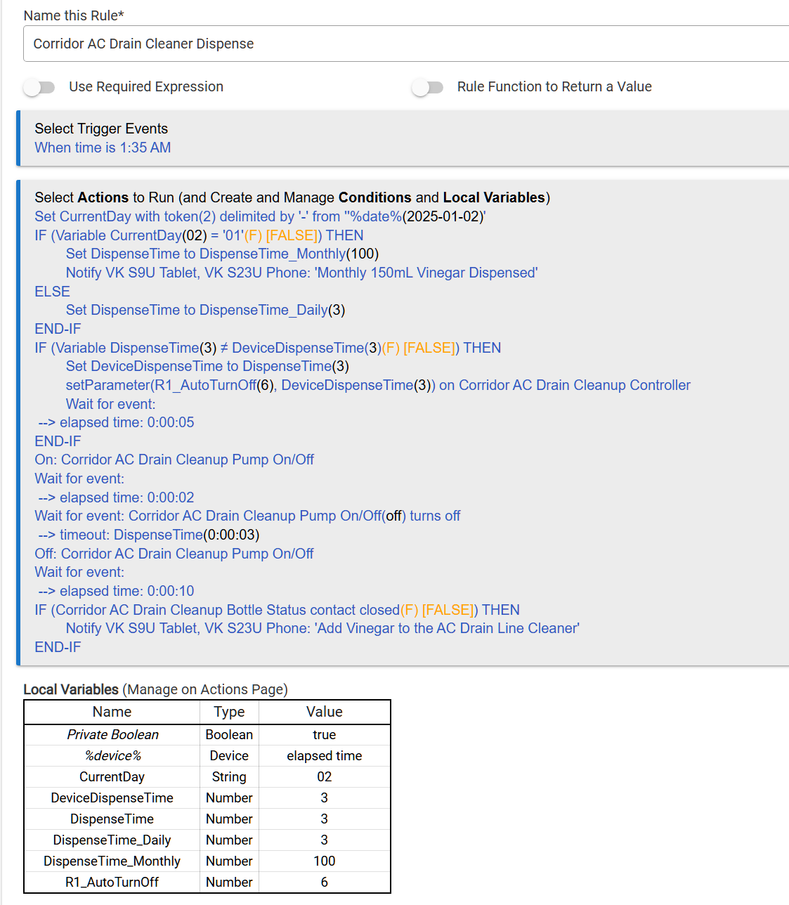 Rule reprograms Auto Off time for Daily/Monthly timeouts and also turns Off pump