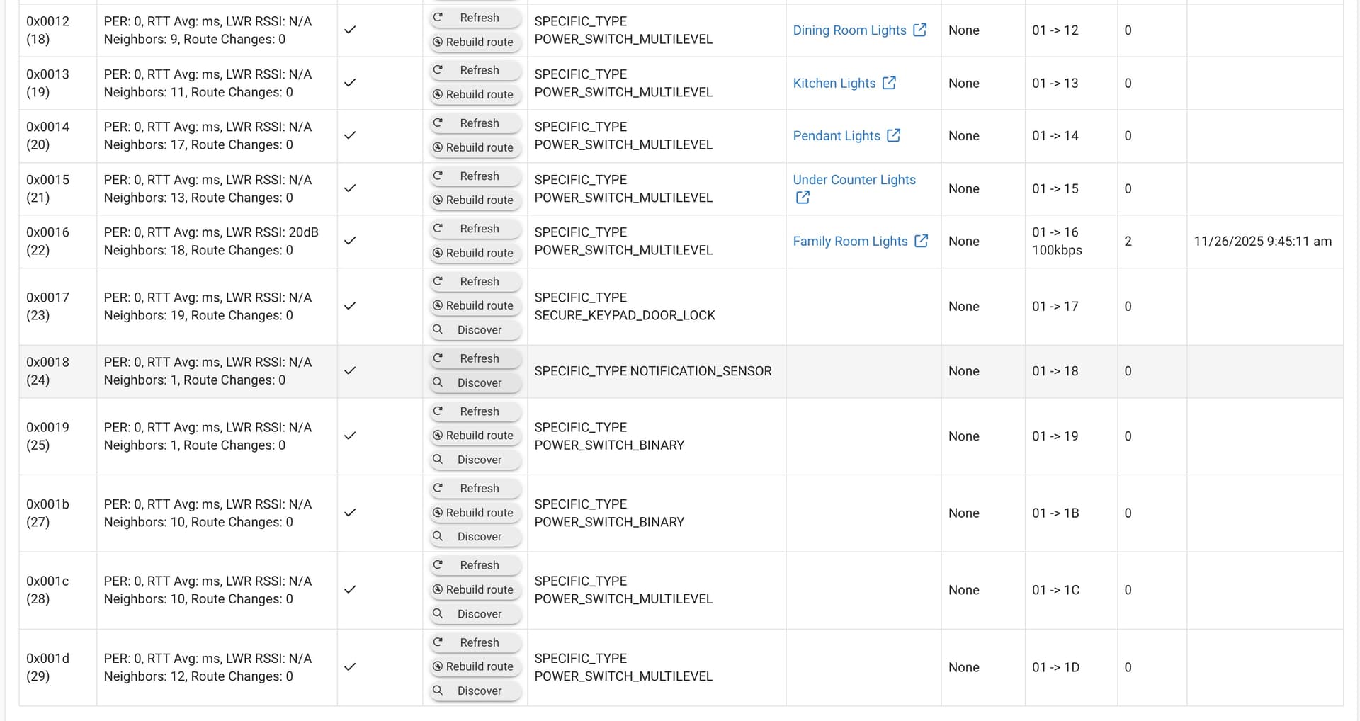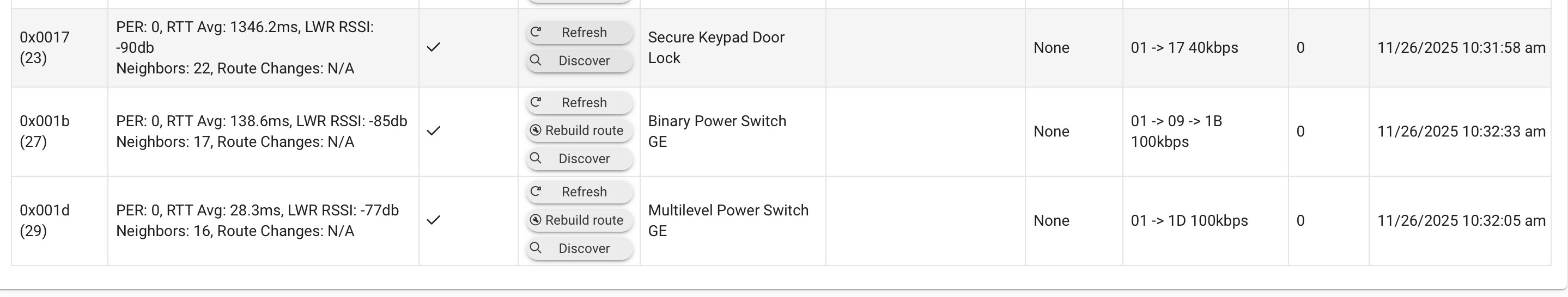 OK. I have it down to three that I can't get to remove in JS mode. I clicked on Discover and nothing happened. The Route column looks different, but I don't know how to find them to assign them in devices. I switched back to ZWave Legacy and refreshed each of those three and the status changed to "Not Responding".