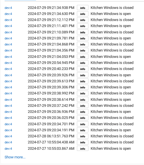 Brain trust, I have a window contact sensor that has caused my Konneted alarm to set off twice. Looking at the event log, the window sensor (actually 4 in series) is open then closing many times per minuts. See below: