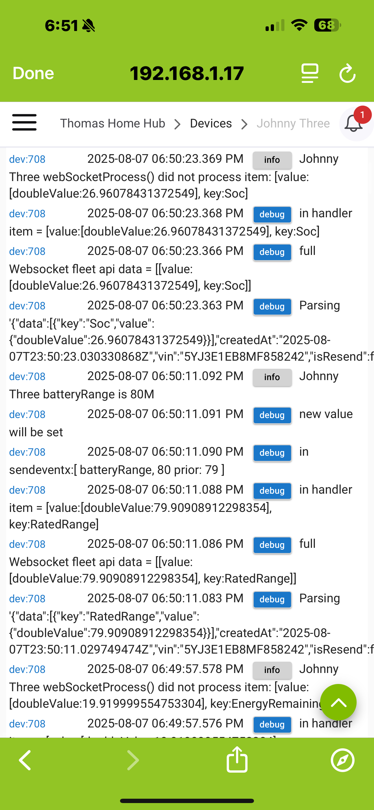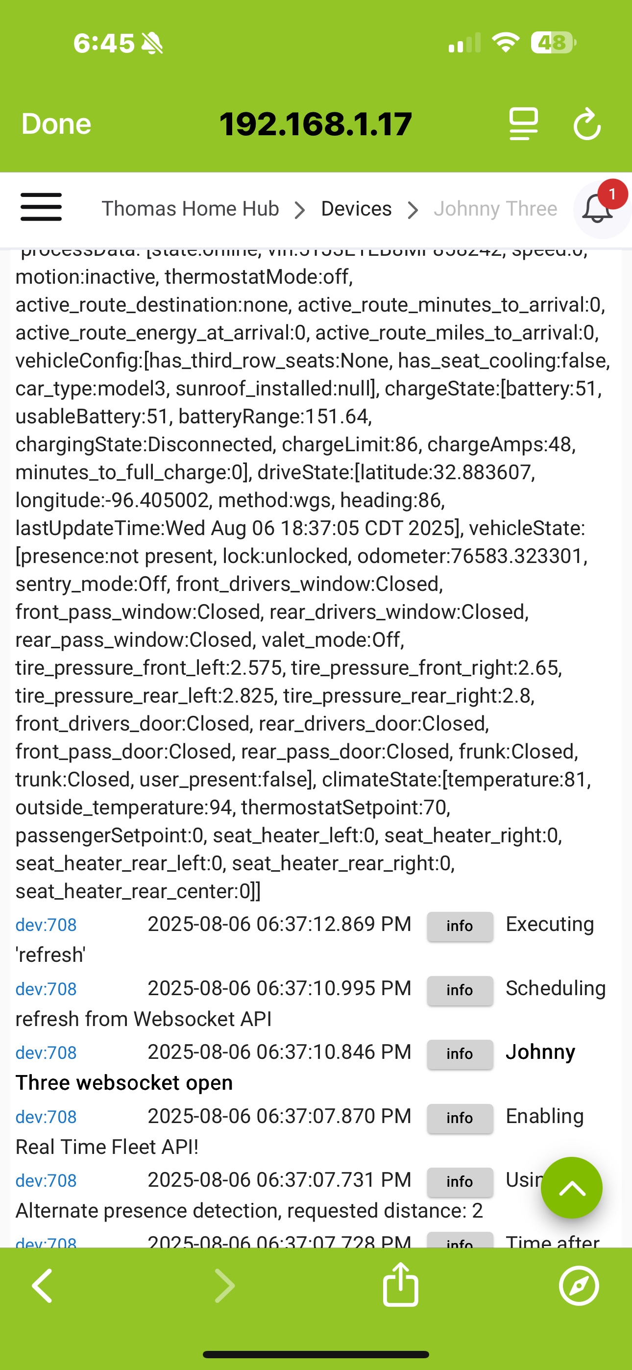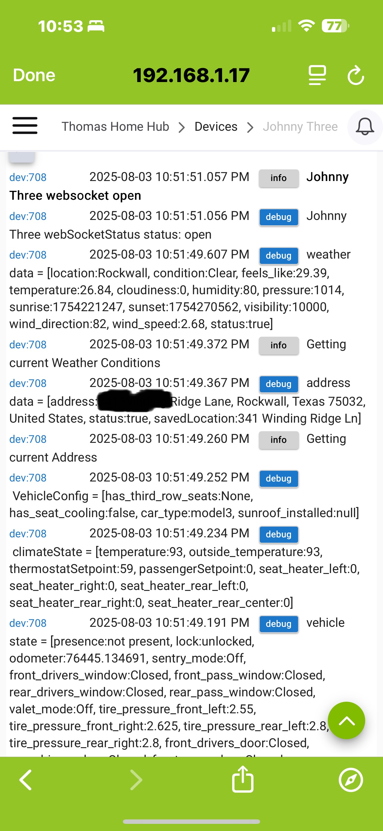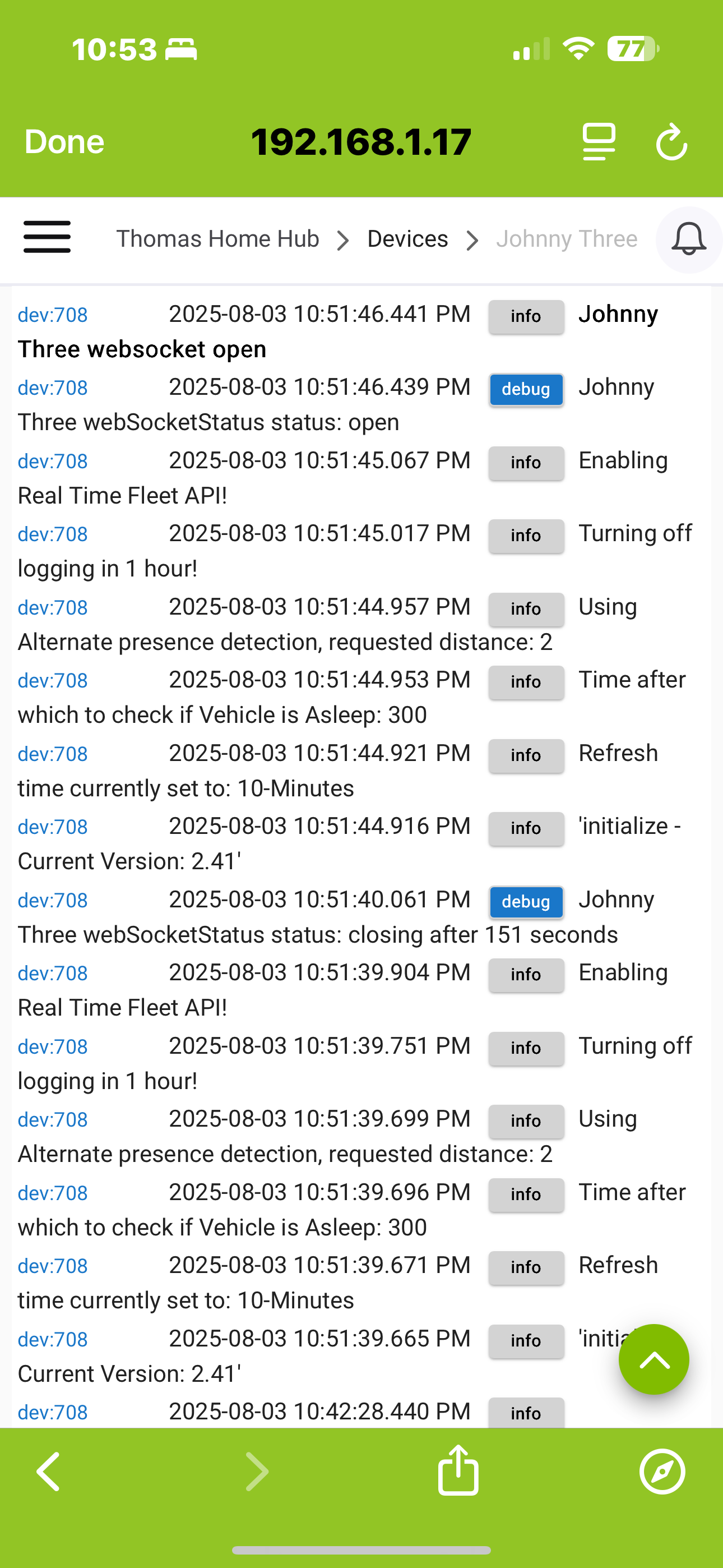 ok I had a thought with websocket API on. turn on debugging in the car device as so