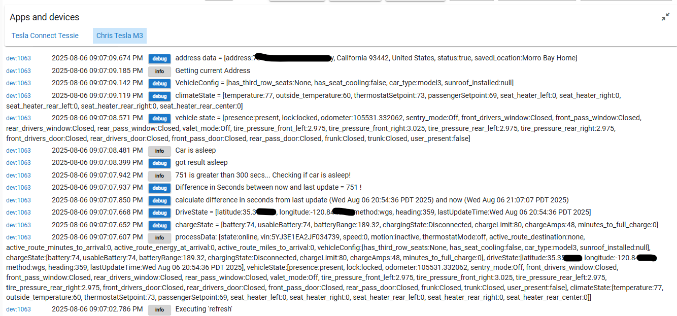 When you contact tessie this post you posted shows you getting data via the websocket/fleet api. if you turn debugging back on every message you get should show the "in handler item" line. those are named pairs coming from the fleet api via tessie. but you are not getting very much data or the longitude and latitude pairs which the car is moving or you did not post that info. when the car is moving you should get constant speed heading etc as well as long and lat pairs every 10-15 secs. I cannot show you what it looks like, as i am away from my cars till oct. maybe someone else can turn debugging on and post the log showing what it is SUPPOSED to look like.
