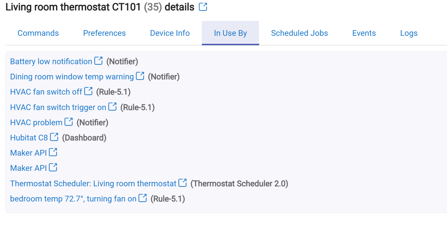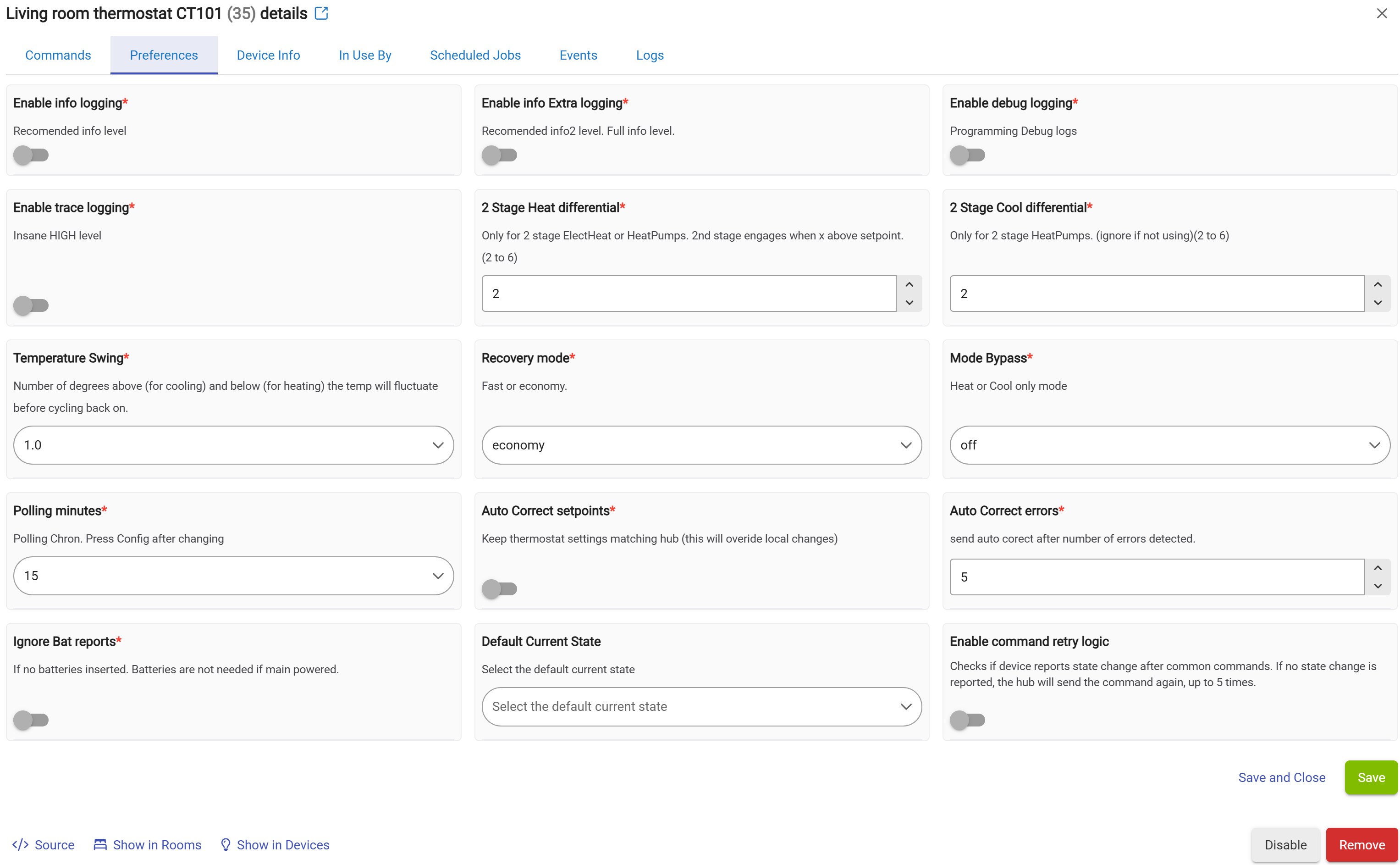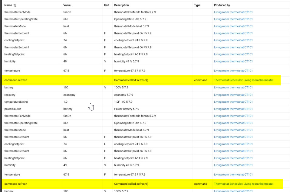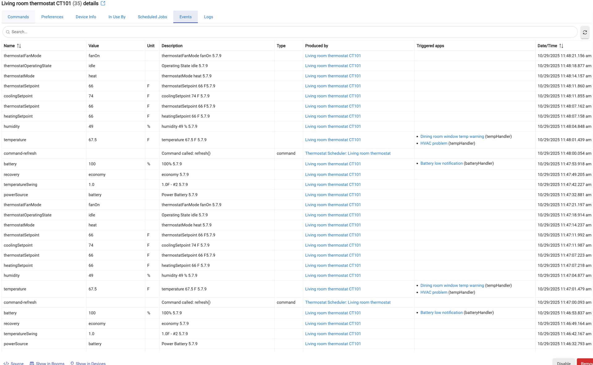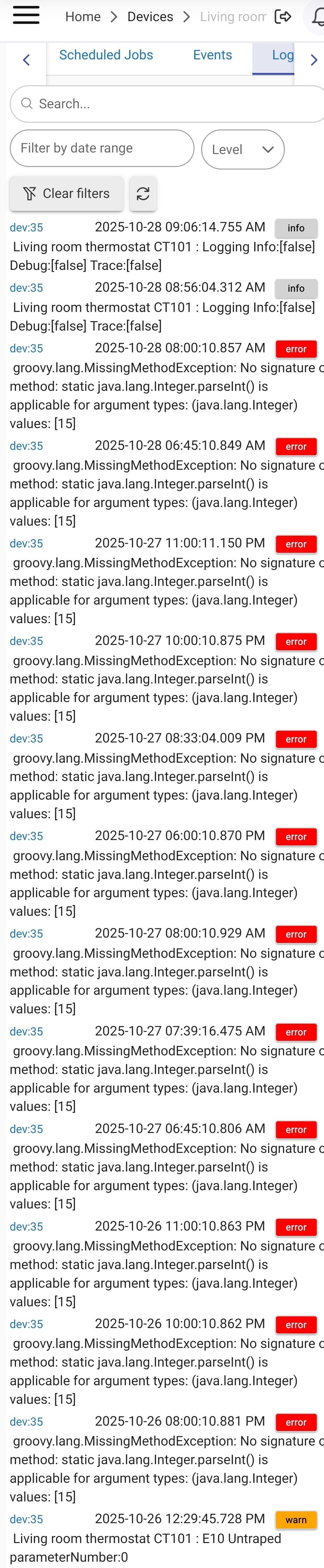 First screenshot is from the zwave log page. Second two are the zwave device page details (living room thermostat ct101), and the rest are from the logs on the device page next to events.