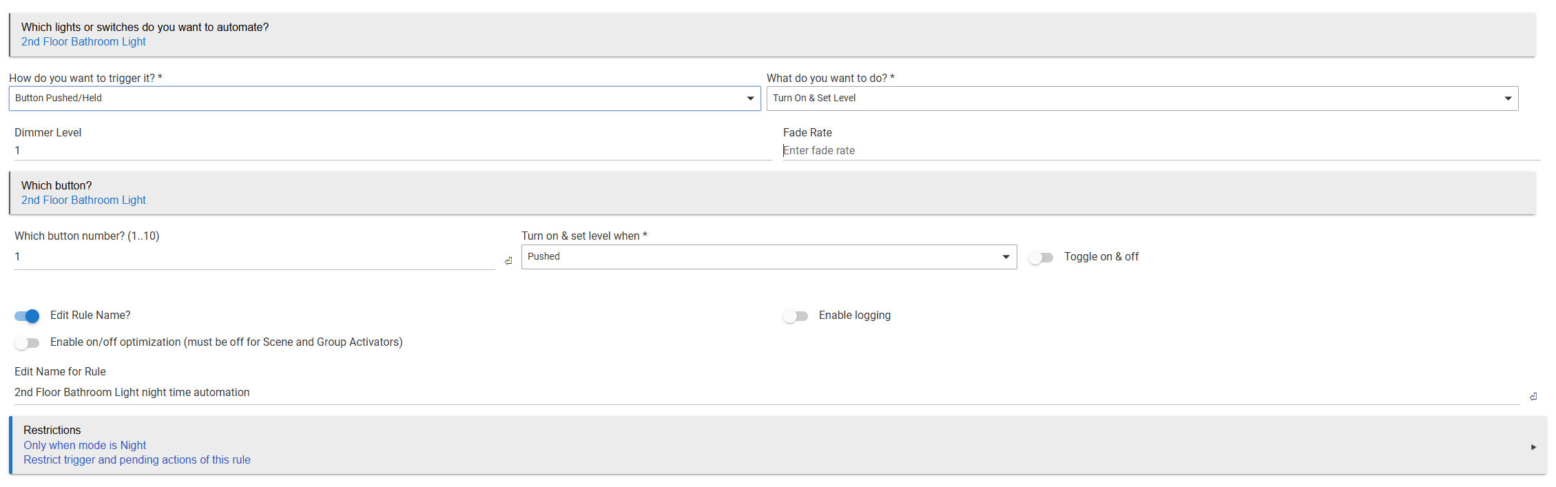 Below is the rule and the events on the device. No one cares but my OCD, guess I could just write a rule to turn the light to 1% then off right after switching to night mode, but curious if others have a workaround.