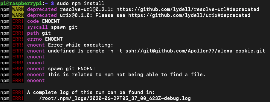 I am in process of moving my homebridge and other node related applications from my Mac to a raspberry pi. I am trying to get AlexaCookie up and running on my pi and when I run "npm install" (with sudo), I am getting the attached error. It looks like the Apollo77 code base changed recently. Is that related?