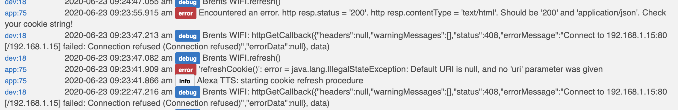 Hi everyone, I've been using the Alexa TTS for a bit in the beginning of the year and it was working flawlessly. I recently moved and now its not working im getting a "check your cookie" message and this comes up in the logs