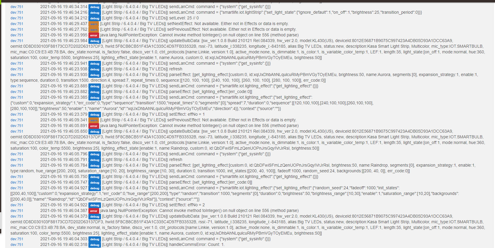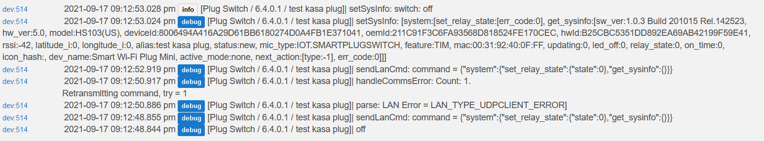 Device: What is your device type. I have nine Kasa device drivers, so without this it is hard to troubleshoot/verify functionality.