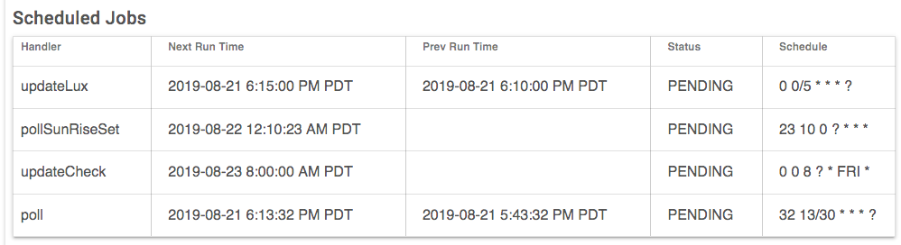 poll (of APIXU) occurs on the 18th second every /30 (30 mins, per Preferences) and updateLux occurs on the 0th second, every /5 (5 mins, per Preferences.) pollSunRiseSet runs on the 23rd second of the 10th minute of each new day. [updateCheck, a variation of Cobra's version checking, runs once on Fridays.]