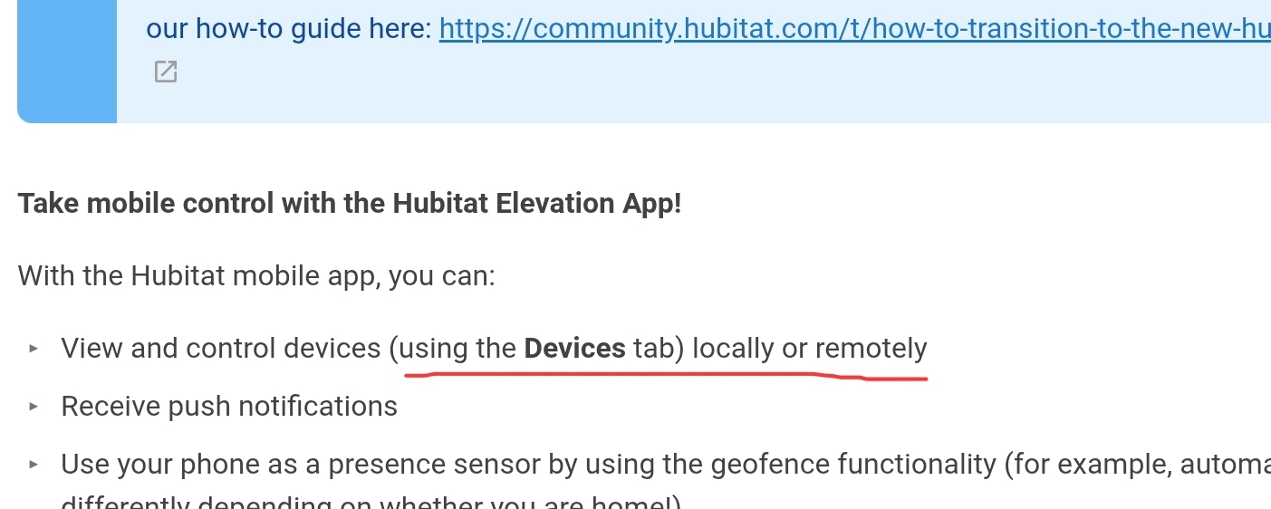 tray_e, yes you're correct the 'devices' tab (lightbulb icon) in the app works locally, but not remotely. I've used Hubitat since 2020 and the 'devices' tab (lightbulb icon) in the app has always worked locally as well as remotely. Again, in the old app, currently, this functionality works and it has also worked in the new app until recently.