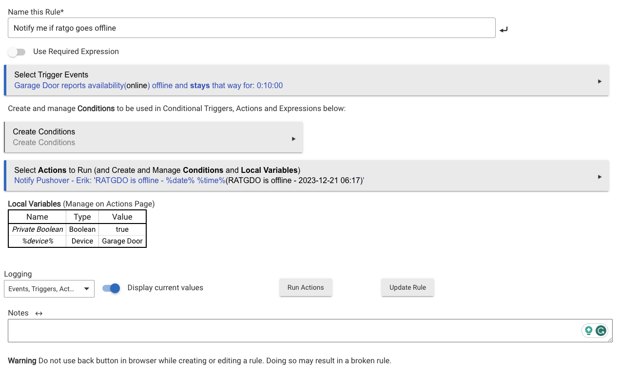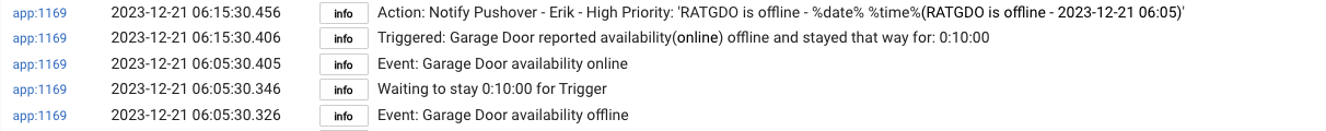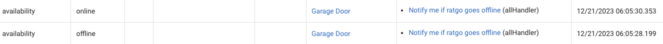 6:15 the notification goes out reporting Triggered: Garage Door reported availability(online) offline and stayed that way for: 0:10:00