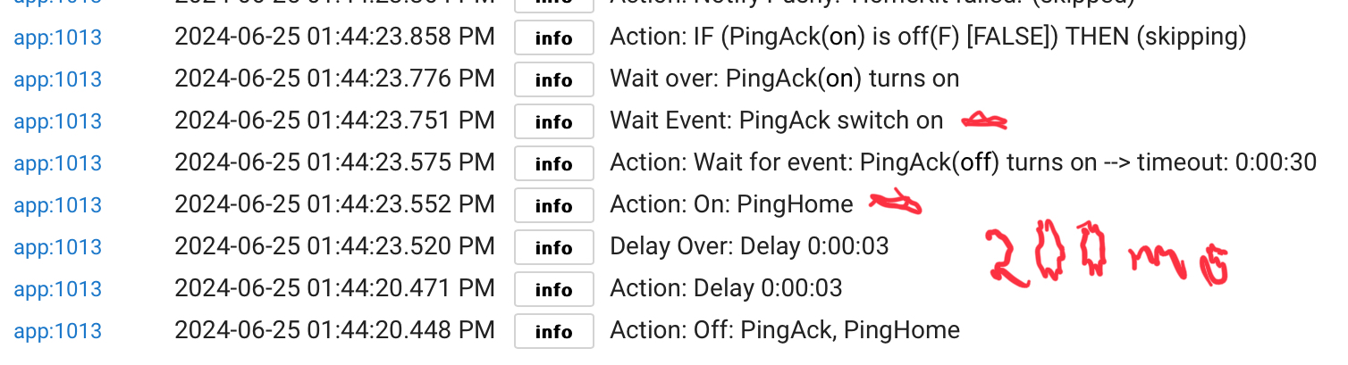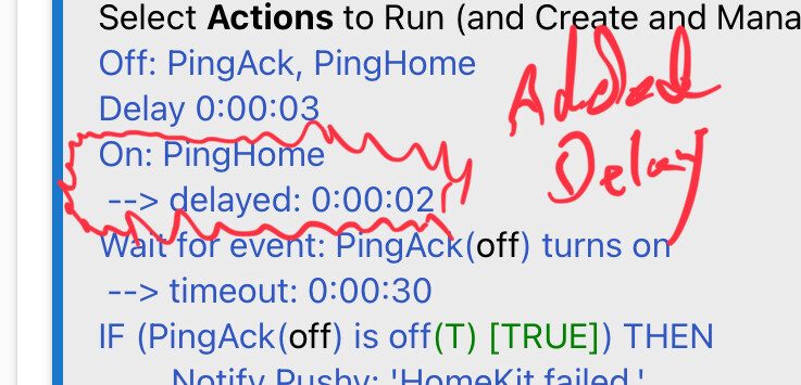 Or the hub could be under more load than usual and take more time to get to the next action (Wait) than it took for the Homekit integration to register the change in PingAck.