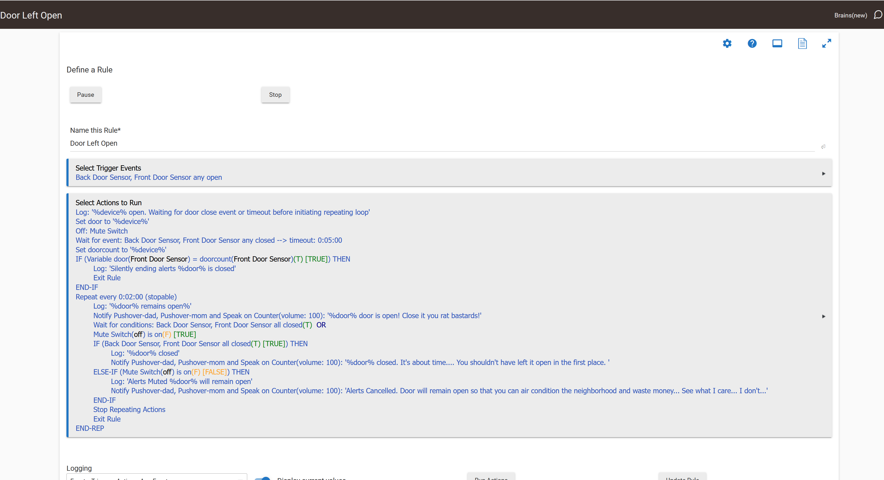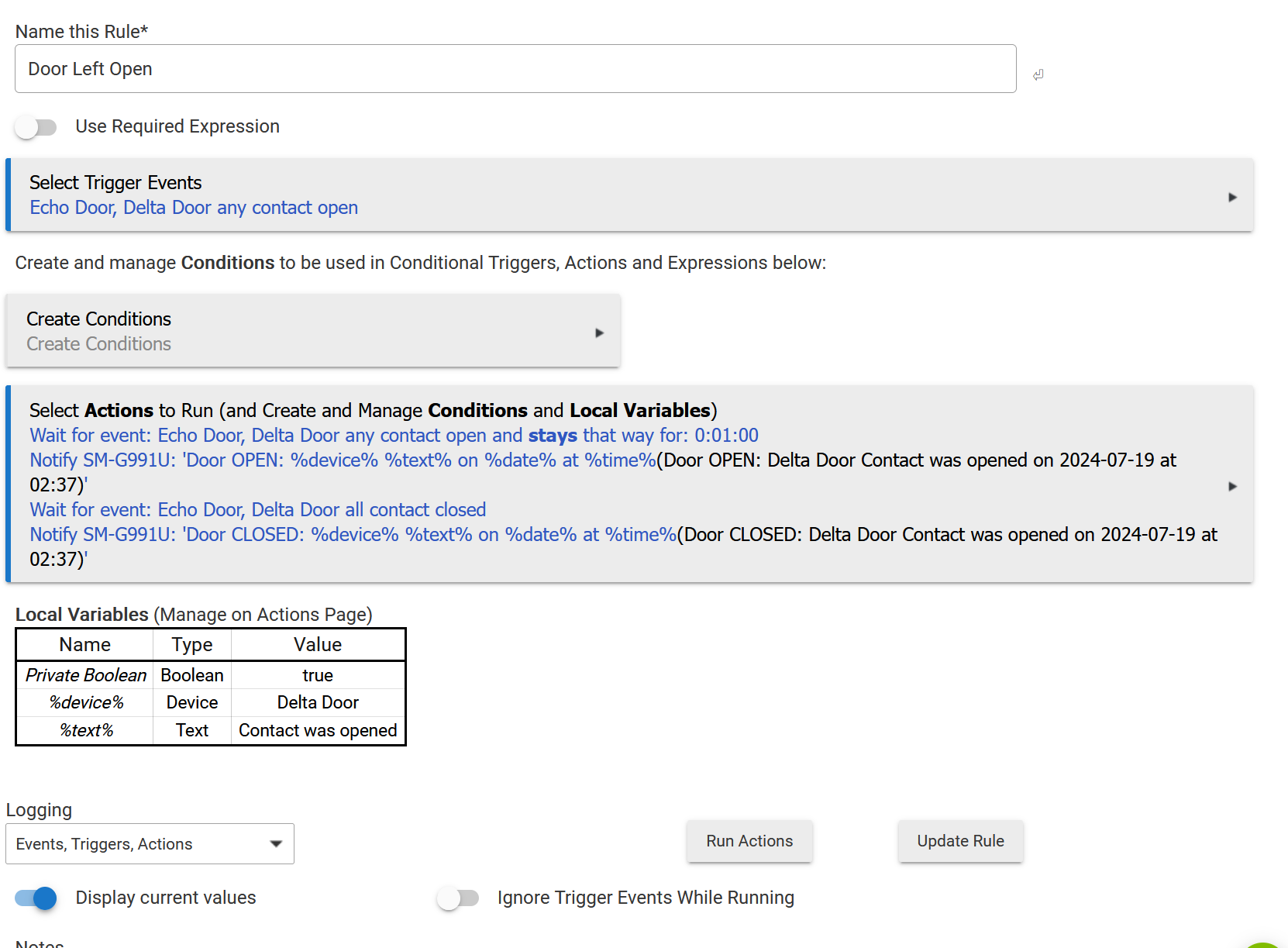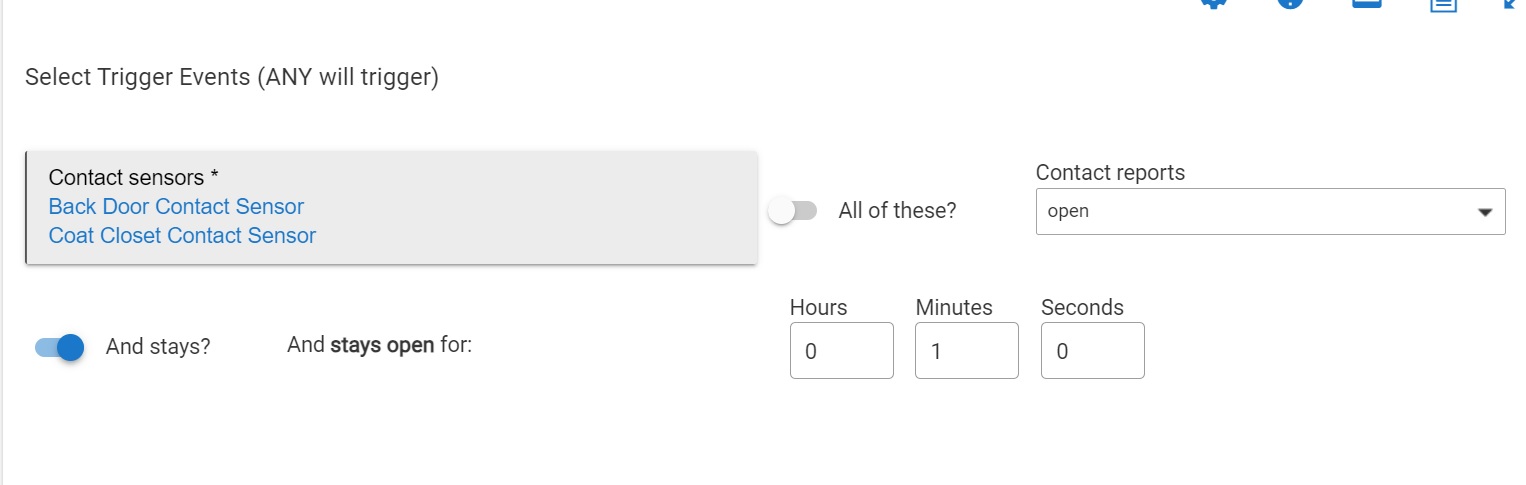 I just want to be notified after either of 2 doors has been left open for over a minute. Then I want to be notified again when both doors are closed. This doesn't seem that complicated, but I never get even the first message about one door being left open.