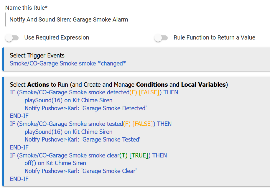 Also for as an alarm for the Smoke/Co detector in the garage, and the Zooz ZEN55 smoke/co dc sensor. That uses the appropriate alarm sound with a rule below (for smoke).