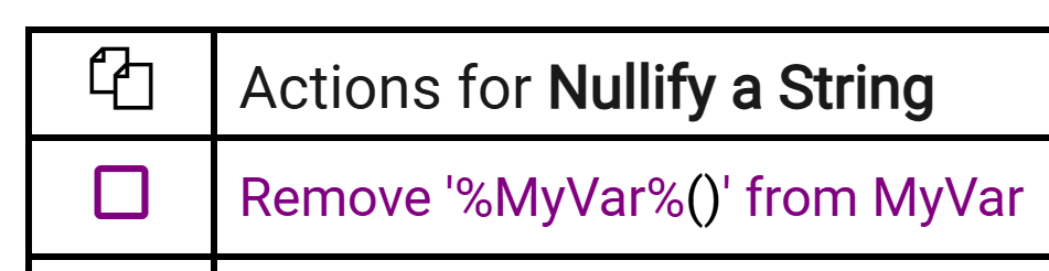 This should be trivial but for some reason I can't see to clear the string easily. The only way I could get it to work was to write an arbitrary string (dog) to the variable and then remove that same string in the next instruction. I tried setting string to '' and "" and ' ' and " " but these didn't clear the string as I would have expected. I also can't use the set variable and leave the field blank as you can't exit the set command without putting something in the field.