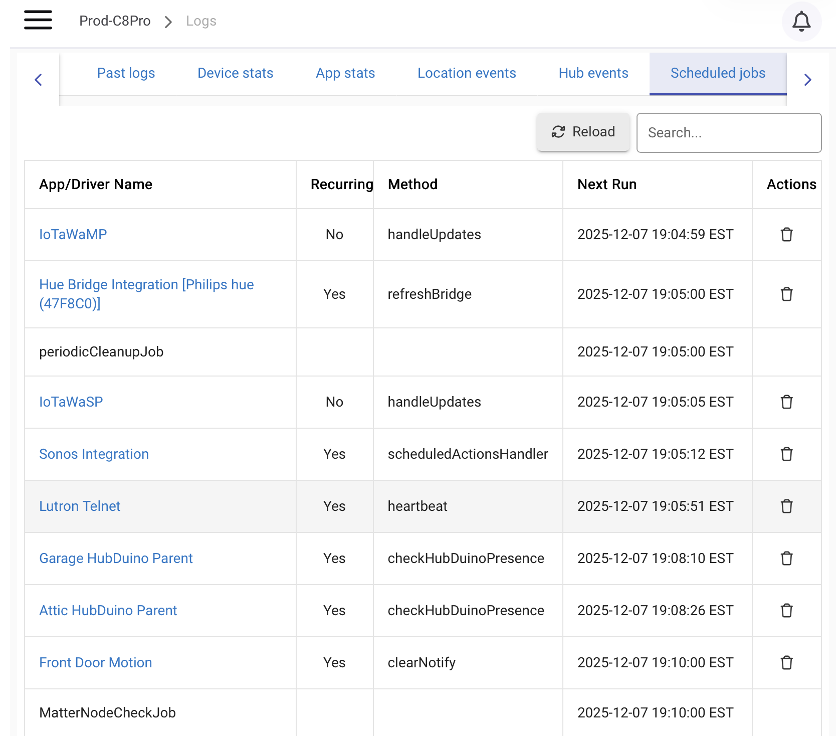 Using that snippet status.jobs.each should give you a set of jobs information that looks similar to {"id":"app2382Recur.clearChldCaches","name":"webCoRE HE","link":"/installedapp/configure/2382","recurring":true,"methodName":"clearChldCaches","nextRun":"2025-12-07 20:19:22 EST","nextRunDt":"2025-12-08T01:19:22+0000"},…