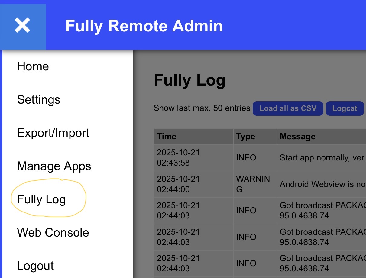 I have rebooted with no luck, updated Fully, and the dashboard loads in chrome on the same device. I will look at the logs, didnt realize there were logs.