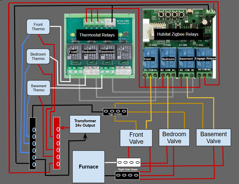 To do this I had to disconnect my thermostat heating wires and instead use a ZigBee Relay board to control the zone valves from Hubitat.