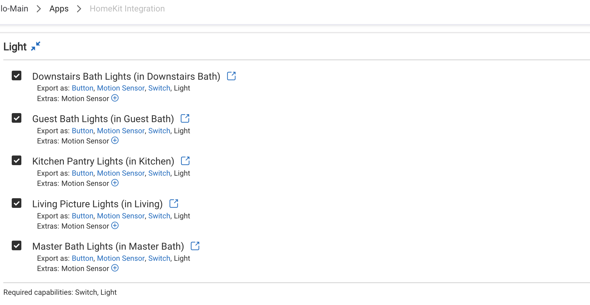 I have a bunch of the Switch variant of these, and they're all set like this (exporting Switch and/or Light (or both) and show up correctly in Homekit: