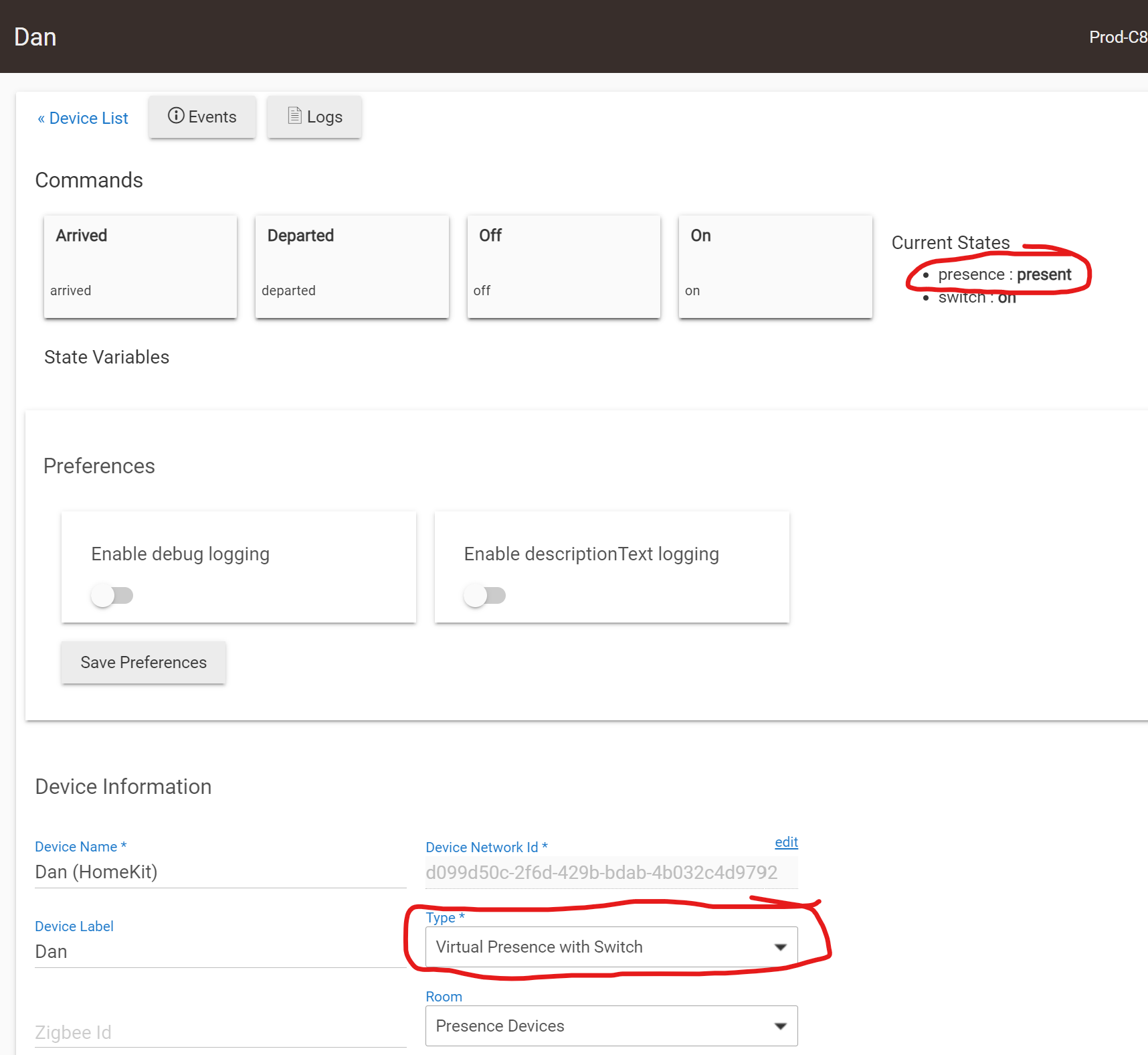 Here is an example of a Virtual Presence with Switch device, that I have exposed to HomeKit using Hubitat's built-in HomeKit (Beta) integration. On the HomeKit side of things, this device simply appears as a Switch device. I have two HK Automations, one to turn the switch on when I arrive at home, and another to turn the switch off when I depart.