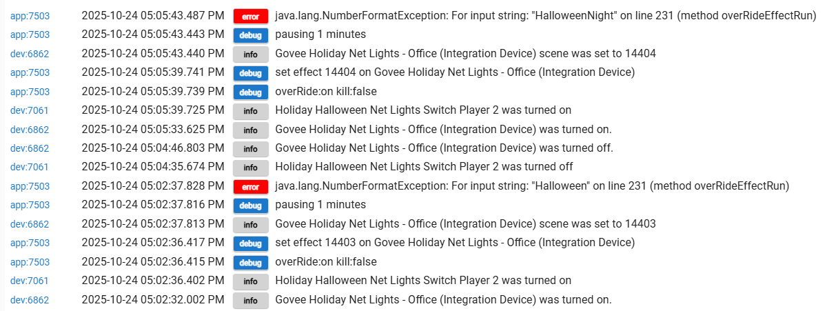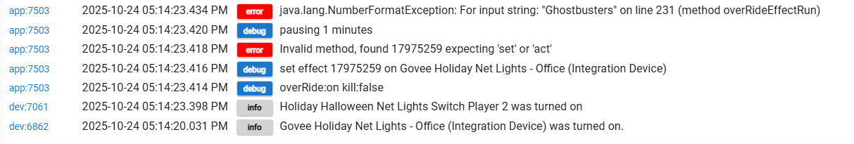 I apologize as this might be the wrong forum topic for this, but it might help in a derivative way (Govee Integration attributes/commands to assist this one). I think that more visibility into the effects' number-name relationship might help. Currently lightEffects usage can require both name and number: name to confirm/check attribute changes (since effectNum is not an official capability attribute), and number to invoke setEffect. Perhaps supporting the capability's lightEffects attribute to allow apps/rules to access/parse it for lookups. Or perhaps commands, such as getLightEffectNum(String effectName) and getLightEffectsName(int effectNum), could expose the information. Either way would allow the user to know only one (number or name) and find the other, so they can invoke and confirm.