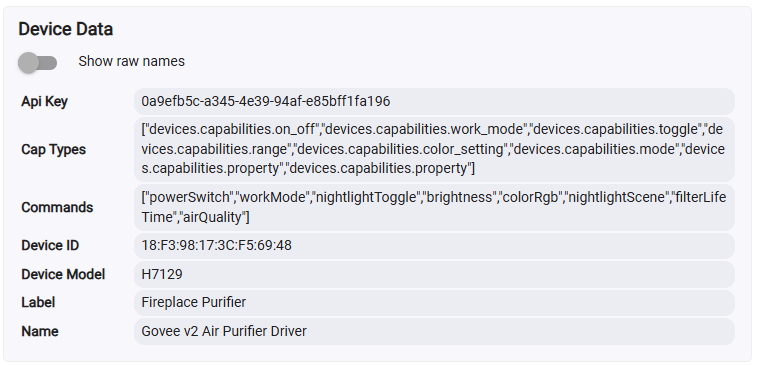 Below is the info that shows up when using the more generic "Govee V2 Air Purifier" driver