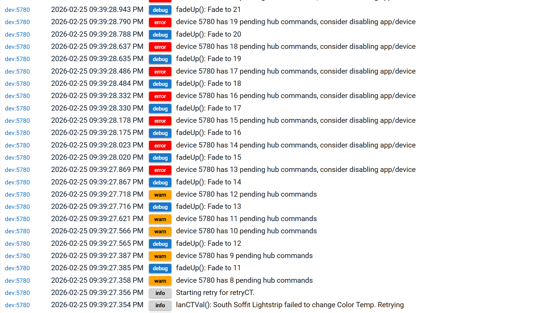 Based on the image what catches my atttention is the "fadeUp" routine was being executed. This functions outside of the retry logic and it's guardrails. When you do a fade which is simply changing brightness over time it can be very intensive on the device based on the size of the interval change and the frequency of changes being sent. There is a calculation that takes the amount of time and devides it by the change in brightness, and if that calculation puts a changes more frequent then 2 seconds it will likely cause those pending hub commands. It looks like it was trying to change the fade in single % values and each increment is aprox 140ms. That will deffinately cause a problem. I would suggest practicing alot of caution when performing fades. I don't use it myself unless the transition is over several minutes.