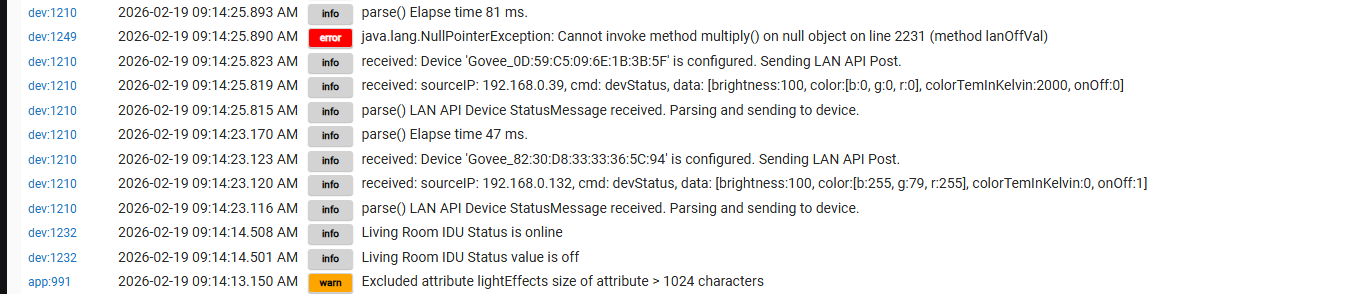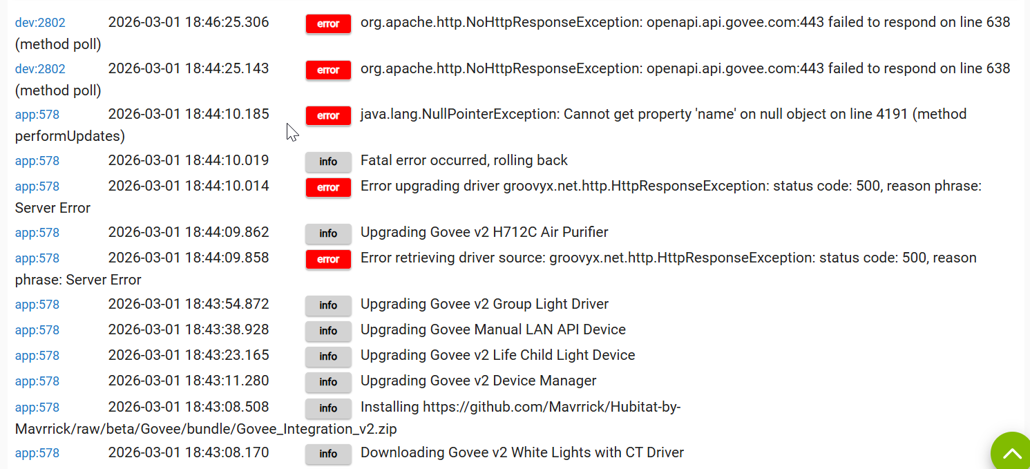 I updated to the latest code recently and I realized that my lights were not turning off when they were supposed to. I looked into it this morning and when I selected off through the device page in Hubitat, I would get a response of "unable to turn off. API Busy pending Off" This occurred on 5 of my Govee light devices. I rebooted the Hubitat and was then able to control the devices once again through Hubitat. However, I am getting an error from each device as shown below: I just wanted to make sure there is not some other issue that is occuring.