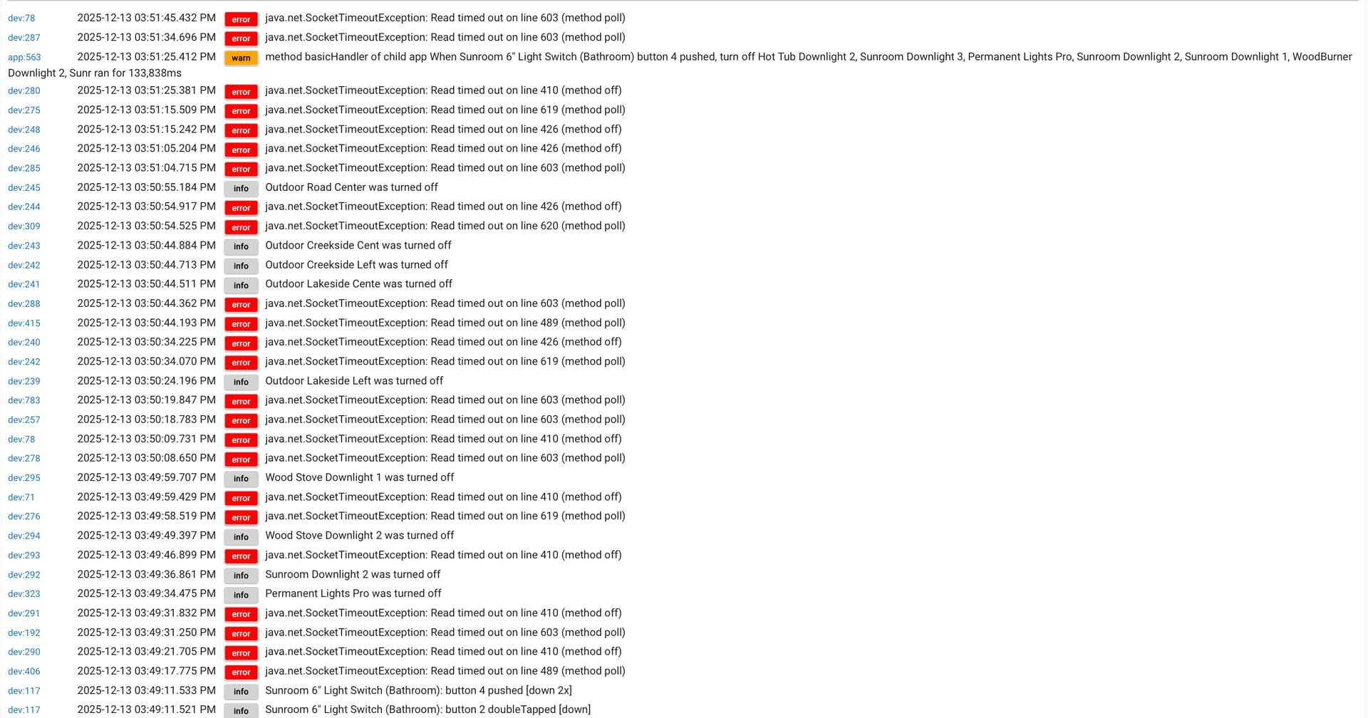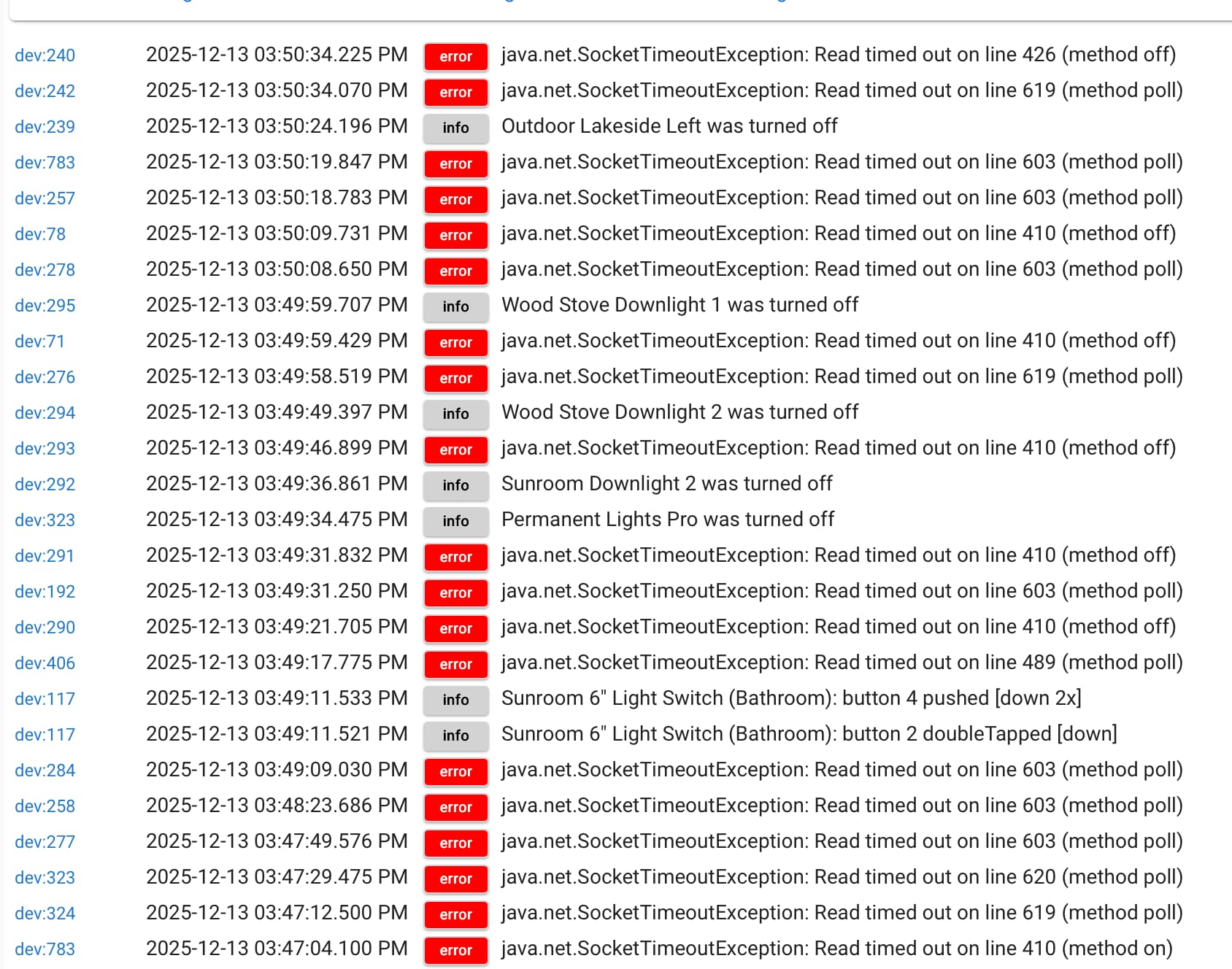 I've been following this group for a while and I'm impressed with the technical acumen of all things Govee in this group. I normally find my answers just reading through the thread. Thank you. But I'm stumped right now. The other day I started to see my system performance slow way down. Looking through the logs, I see a lot of time out errors. I have 82 govee lights (mostly recessed, bulbs and outdoor wall lights). I uploaded my last good backup and now it has the same issues. I am using only the cloud API and a few govee basic scenes. All ZOOZ switches in smart light mode.